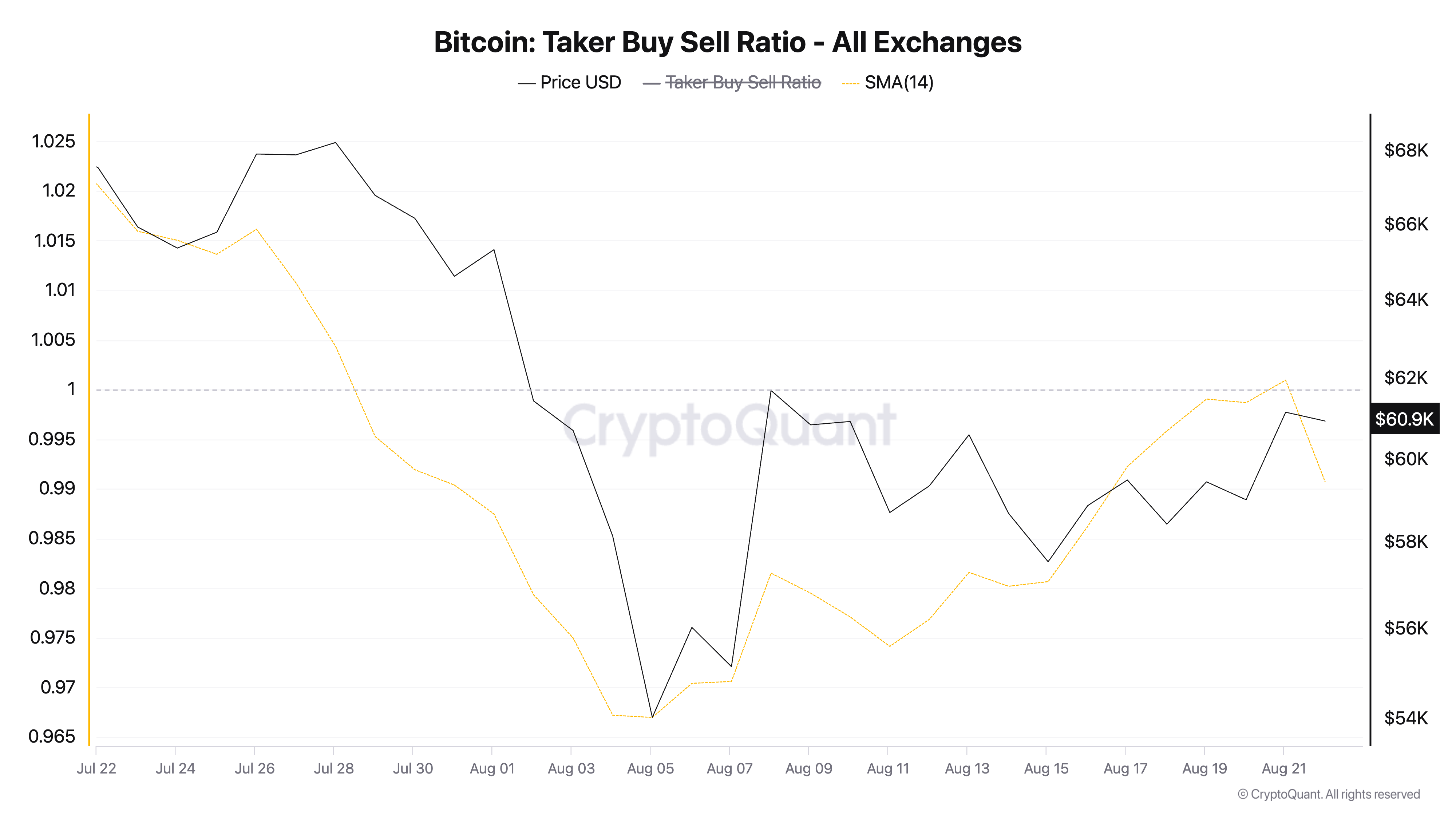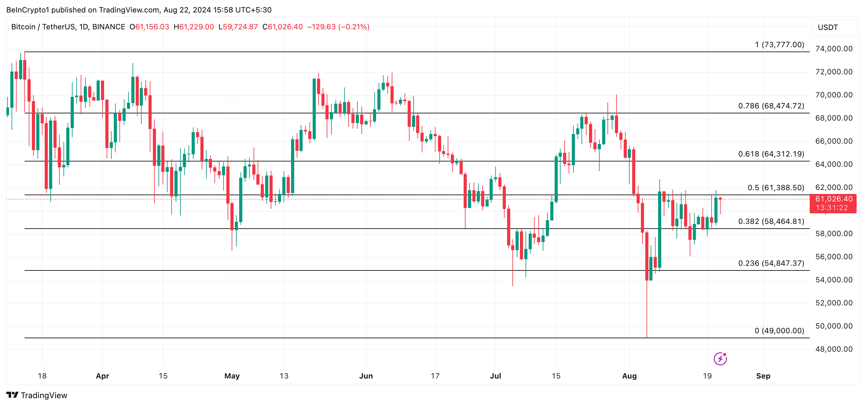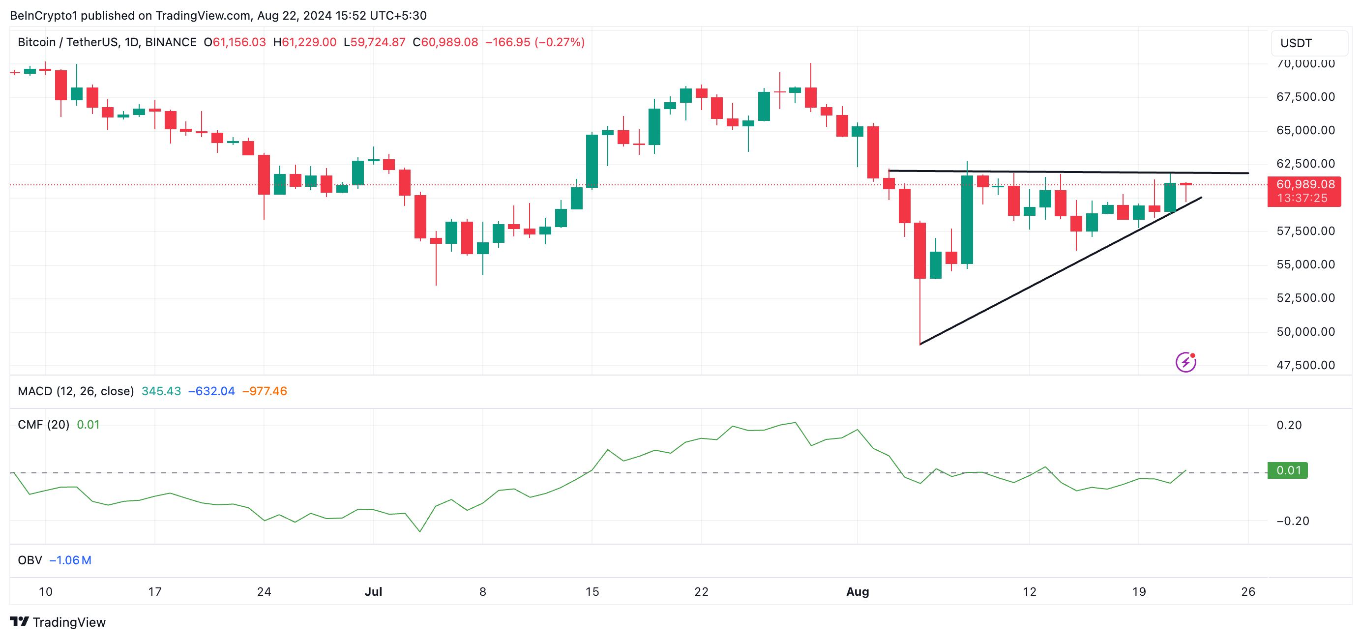 Tällä hetkellä kaupankäynnin kohteena 60 940 dollarilla, johtava kryptovaluutta on toipunut 13% elokuun 5. päivän pohjasta, joka oli 54 018 dollaria.