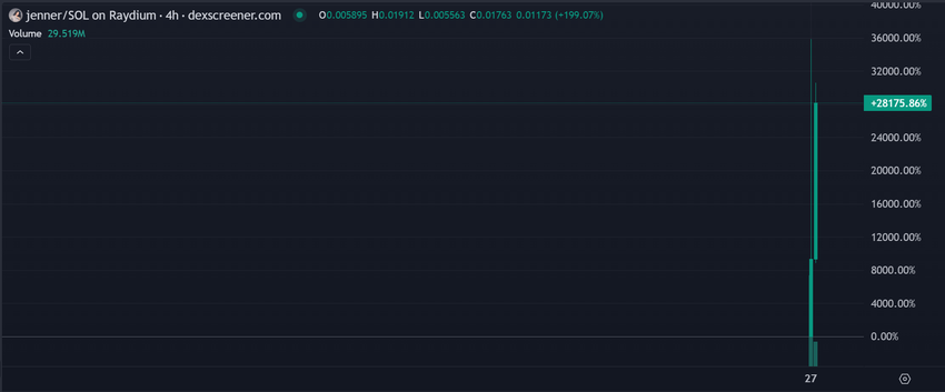 Näistä huolenaiheista huolimatta tokenin hinta nousi dramaattisesti 28 000 % vain yhdessä päivässä. DEX Screenerin tiedot paljastavat, että JENNER on saavuttanut 18 miljoonan dollarin markkina-arvon.