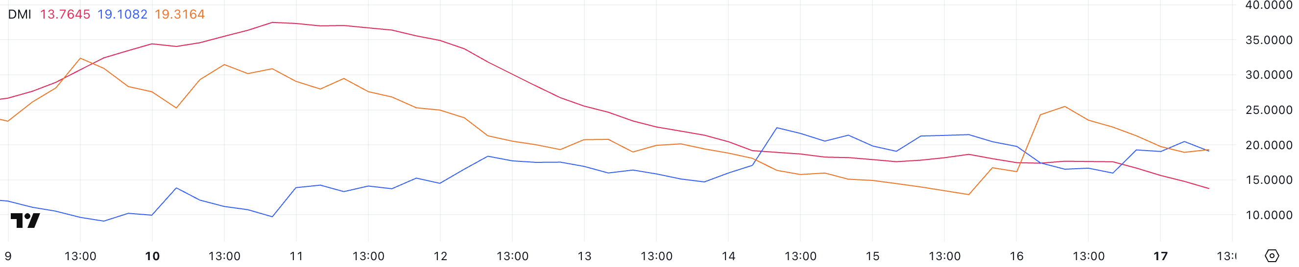 Cardanon DMI-kaavio osoittaa, että sen ADX on pudonnut 13,7:ään 17,5:stä viimeisen 24 tunnin aikana, mikä viittaa heikkenevään trendin voimakkuuteen. Vaikka ADX edelleen osoittaa trendiä, alempi lukema viittaa vähentyneeseen suuntaukseen verrattuna edelliseen päivään.