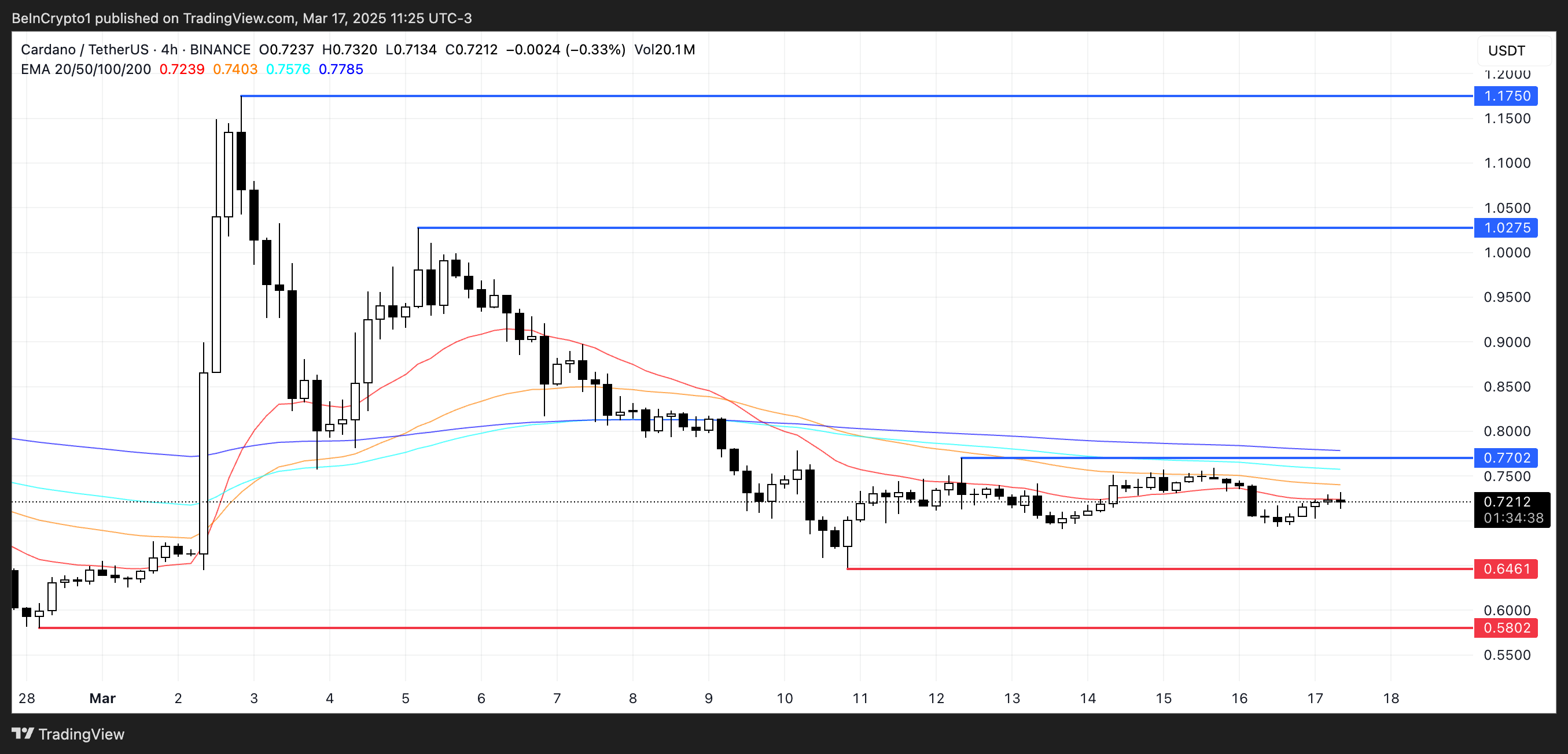 ADA:n EMA-linjat ovat osoittaneet merkkejä konsolidoitumisesta viime päivinä, vaikka kokonaisrakenne pysyy laskusuuntaisena. Lyhyen aikavälin EMA:t ovat edelleen pitkän aikavälin EMA:iden alapuolella.