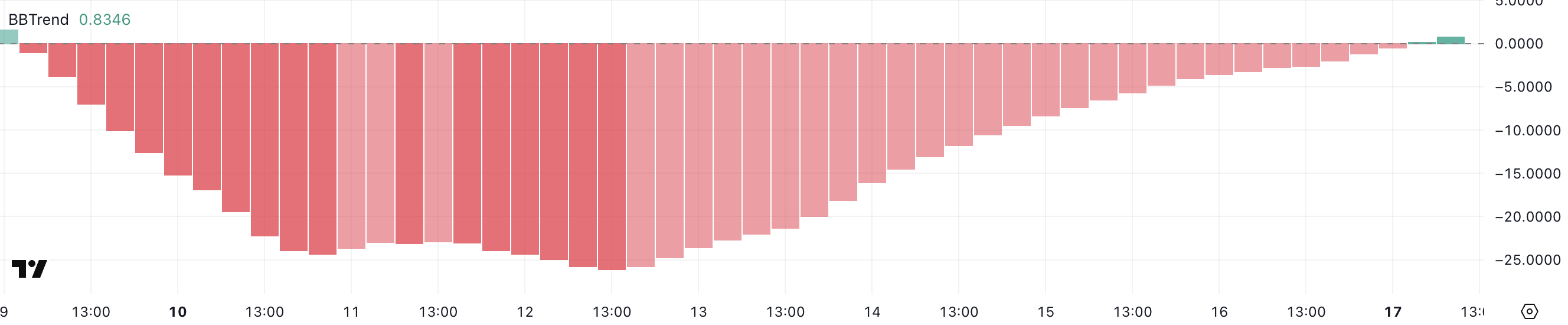BBTrend (Bollinger Band Trend) mittaa hinnan liikkeen voimakkuutta ja suuntaa suhteessa Bollingerin nauhoihin. Positiiviset arvot osoittavat nousutrendiä, kun taas negatiiviset arvot viittaavat laskutrendiin.