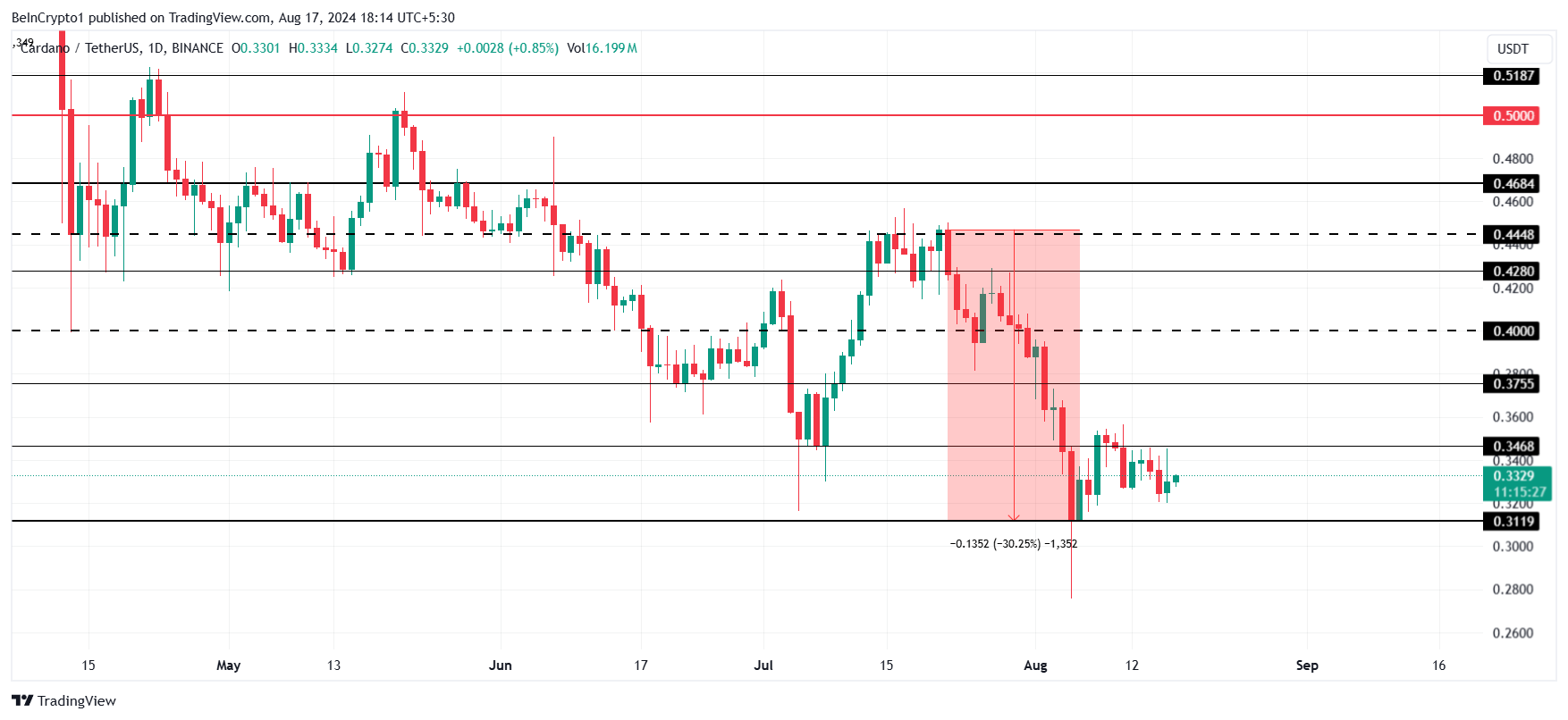 Todennäköinen tulema Cardanolle on sivuttaisliike, 0,346 ja 0,311 dollarin välillä. Nämä tasot ovat toimineet rajoituksina altcoinin konsolidoinnille ja saattavat jatkaa niin.