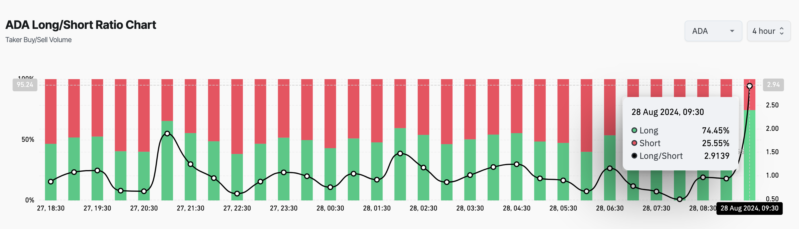 Coinglassin johdannaistietoportaalin mukaan Cardano (ADA):n 4 tunnin Long/Short-suhde on tällä hetkellä 2,91. Long/Short-suhde mittaa ostovolyymia (long) suhteessa myyntivolyymiin (short) futuurisopimuksissa.
