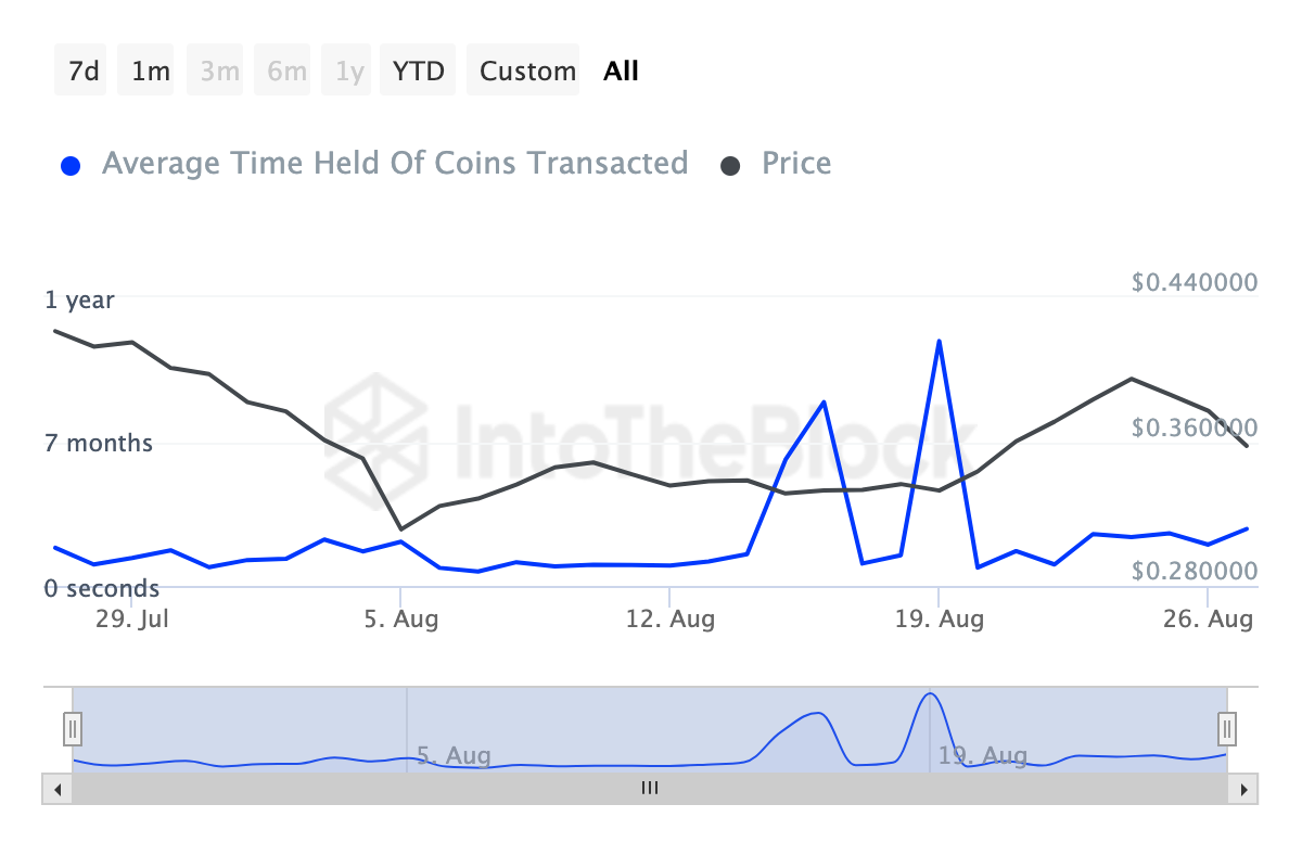 ADA:n tapauksessa Kolikoiden Haltijan Aika on kasvanut 64% viimeisen seitsemän päivän aikana ja vaikuttavat 103% viimeisen 30 päivän aikana. Tämä nousu viittaa siihen, että omistajat pitävät asemiaan, mikä voisi auttaa stabiloimaan ADA:n hintaa ja estämään toisen laskun — ellei markkinoilla tapahdu odottamattomia negatiivisia kehityksiä.