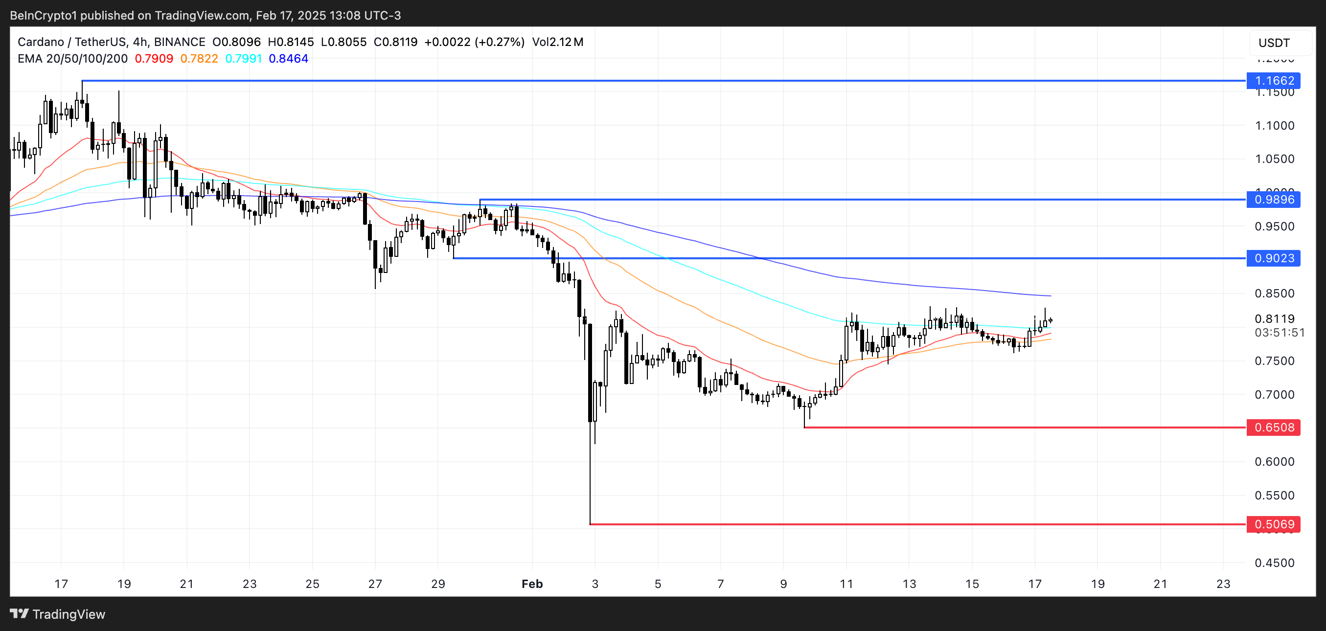 ADA:n EMA-linjat osoittavat lyhyen aikavälin liukuvien keskiarvojen nousevan, mikä viittaa mahdolliseen noususuuntaan. Jos golden cross muodostuu, Cardano-hinta voisi jatkaa nousuaan testatakseen vastusta 0,90 dollarissa.