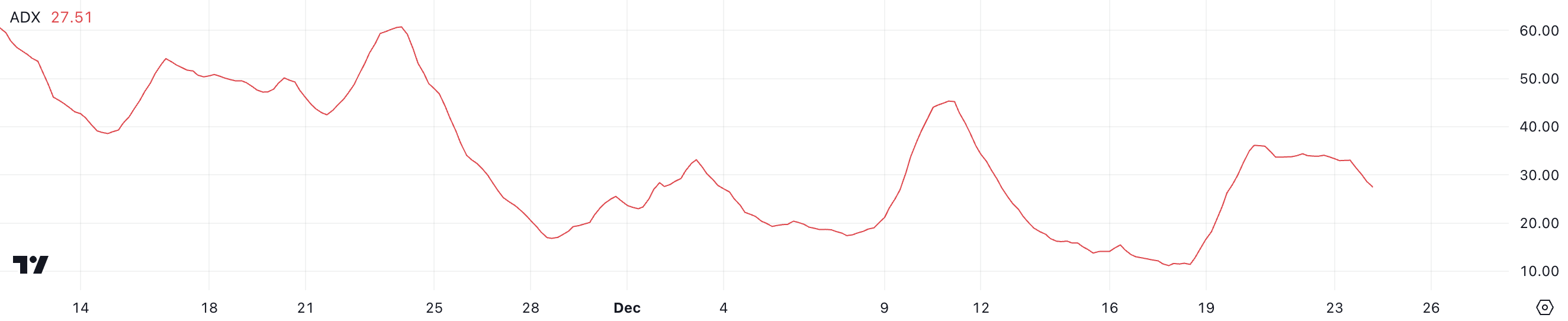 ADA:n Average Directional Index (ADX) on tällä hetkellä 27,5, nousten alle 20:stä 19. joulukuuta, mutta laskien hieman yli 30:stä viime päivinä. Tämä ADX:n vaihtelu heijastaa muutoksia Cardanon jatkuvan laskusuuntauksen voimakkuudessa.