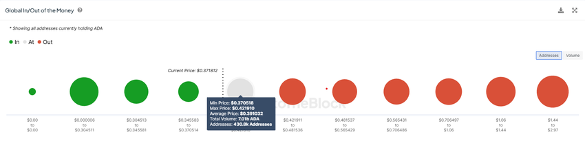 Global In/Out of the Money (GIOM) -indikaattorin mukaan tässä on kyse noin 7,01 miljardista ADA:sta, jonka arvo on yli 2,5 miljardia dollaria. Tarjonta ostettiin, kun ADA:n arvo oli 0,37–0,42 dollaria.