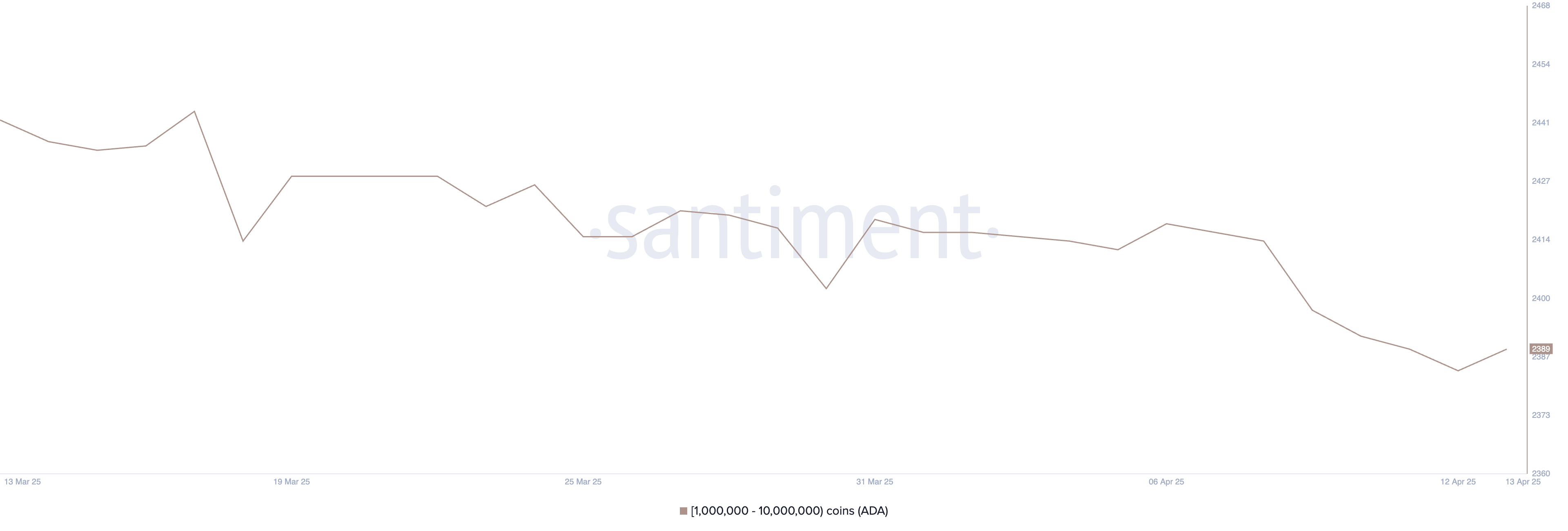 Cardano-valasosoitteiden määrä—ne, jotka pitävät hallussaan 1–10 miljoonaa ADA:ta—laski tasaisesti 6. huhtikuuta ja 12. huhtikuuta välisenä aikana, pudoten 2 418:sta 2 384:ään. Tämä oli alhaisin taso sitten helmikuun 2023.