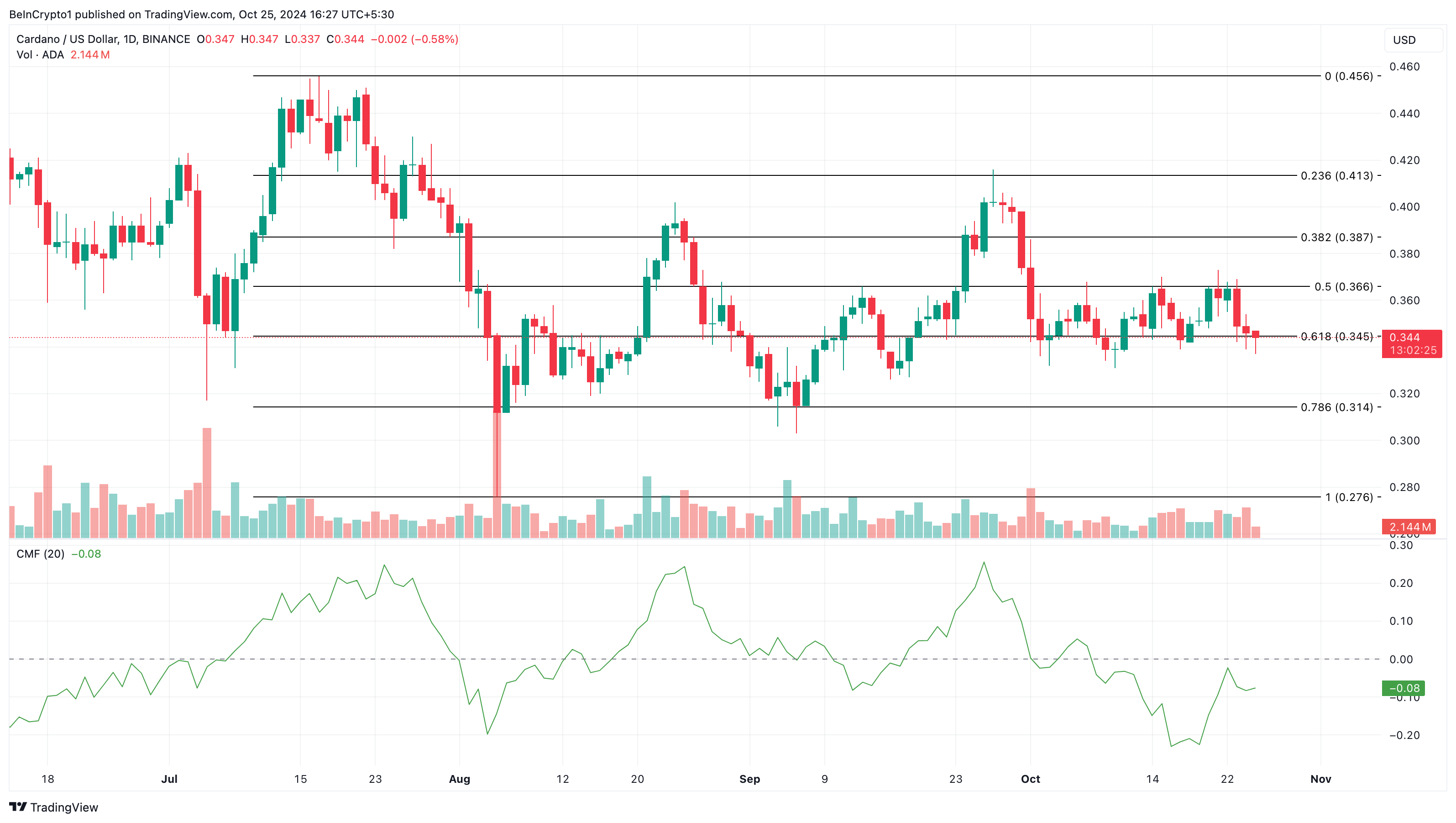 Nouseva CMF viittaa vahvaan kertymiseen, kun taas matala lukema viittaa lisääntyneeseen jakautumiseen. Ottaen huomioon ADA:n nykytilan, hinta saattaisi lyhyellä aikavälillä laskea 0,31 dollariin.