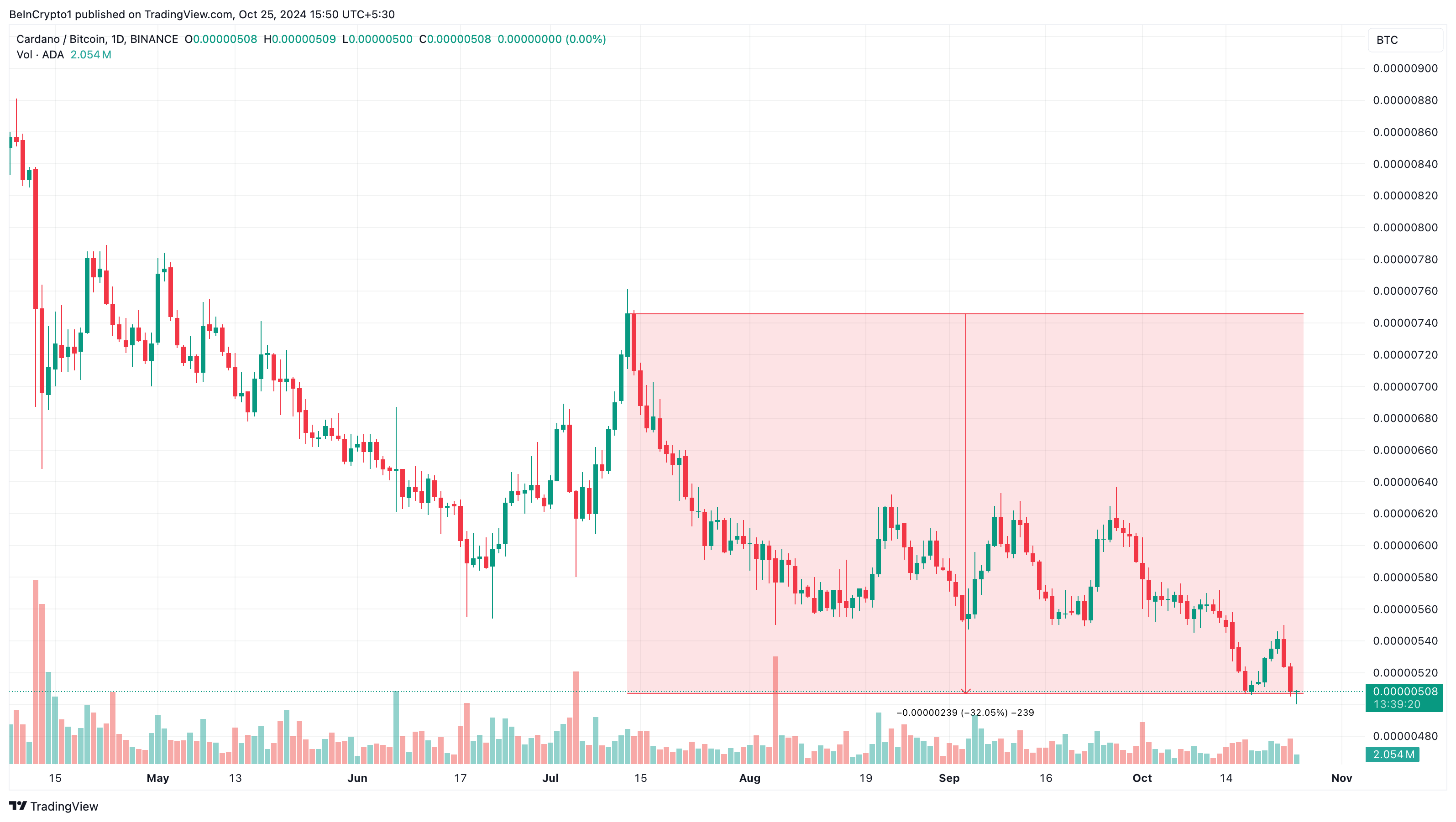 Tämän kehityskulun myötä markkinatarkkailijat saattavat miettiä, lujittaako se yhteyksiä Cardanon ja Bitcoinin hinnan ympärillä. Heinäkuusta lähtien Cardanon hinta on laskenut 32% suhteessa Bitcoiniin, mikä korostaa johtavan kryptovaluutan parempaa suorituskykyä.