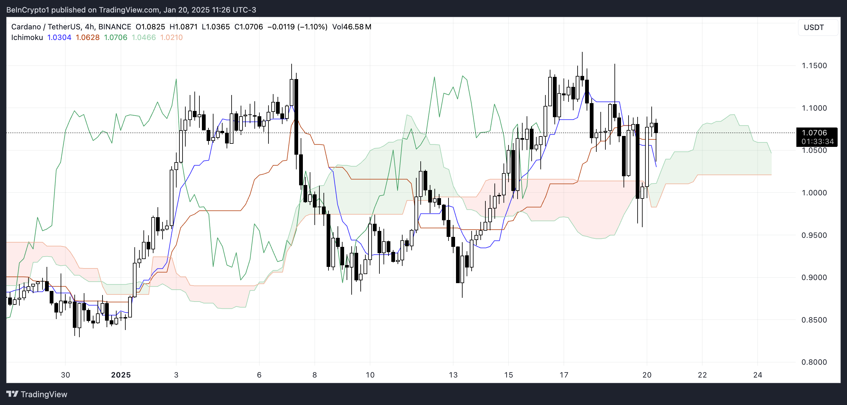 Ichimoku Cloud -kaavio heijastaa edelleen nousujohteista asetelmaa, mutta kapenevat pilvikuviot viittaavat mahdolliseen epäröintiin tunnelmassa. ADA:n kyky ylläpitää noususuuntaa tai kohdata korjaus riippuu sen kyvystä murtaa keskeiset vastustasot tai pitää kriittiset tukialueet.