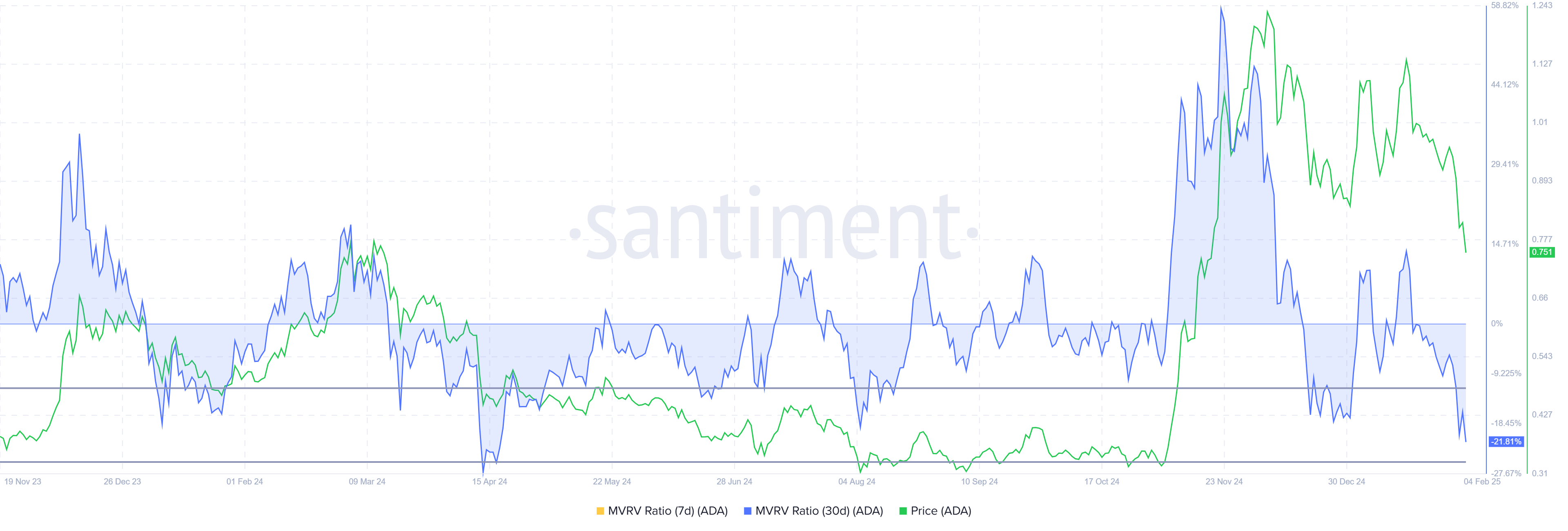 Käyttäytyminen on linjassa aiempien trendien kanssa, joissa Cardano on kokenut vahvan palautumisen pudottuaan tälle mahdollisuusalueelle. Markkinatunnelma viittaa siihen, että vaikka hinta on laskenut, näkymät pysyvät positiivisina ja pitkien laskukausien riski on vähäinen.