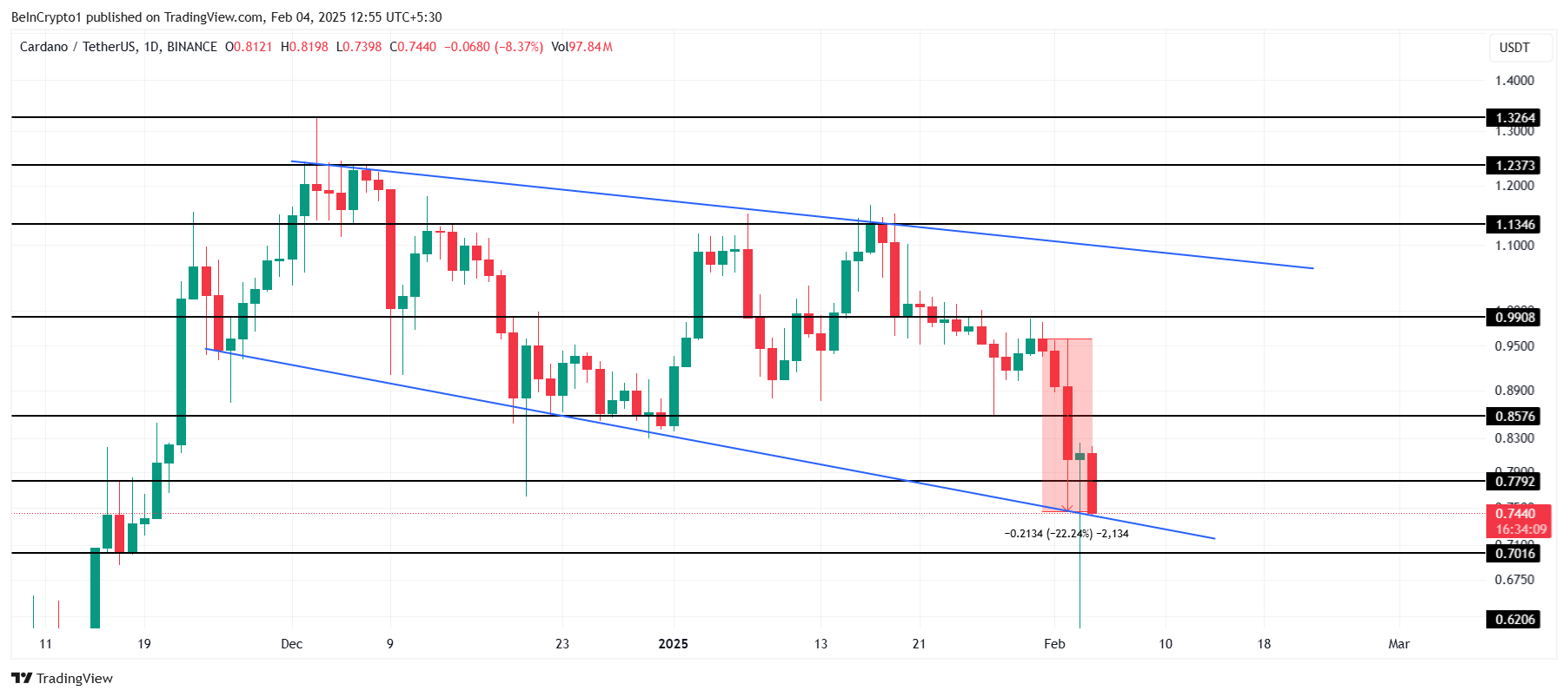 Cardanon hinta on tällä hetkellä 0,74 dollaria, laajenevassa laskevassa kiilassa. Tämä kuvio viittaa yleensä nousujohteiseen läpimurtoon, ja odotettavissa on 45 %:n nousu ylätrendiin, noin 1,05 dollariin.