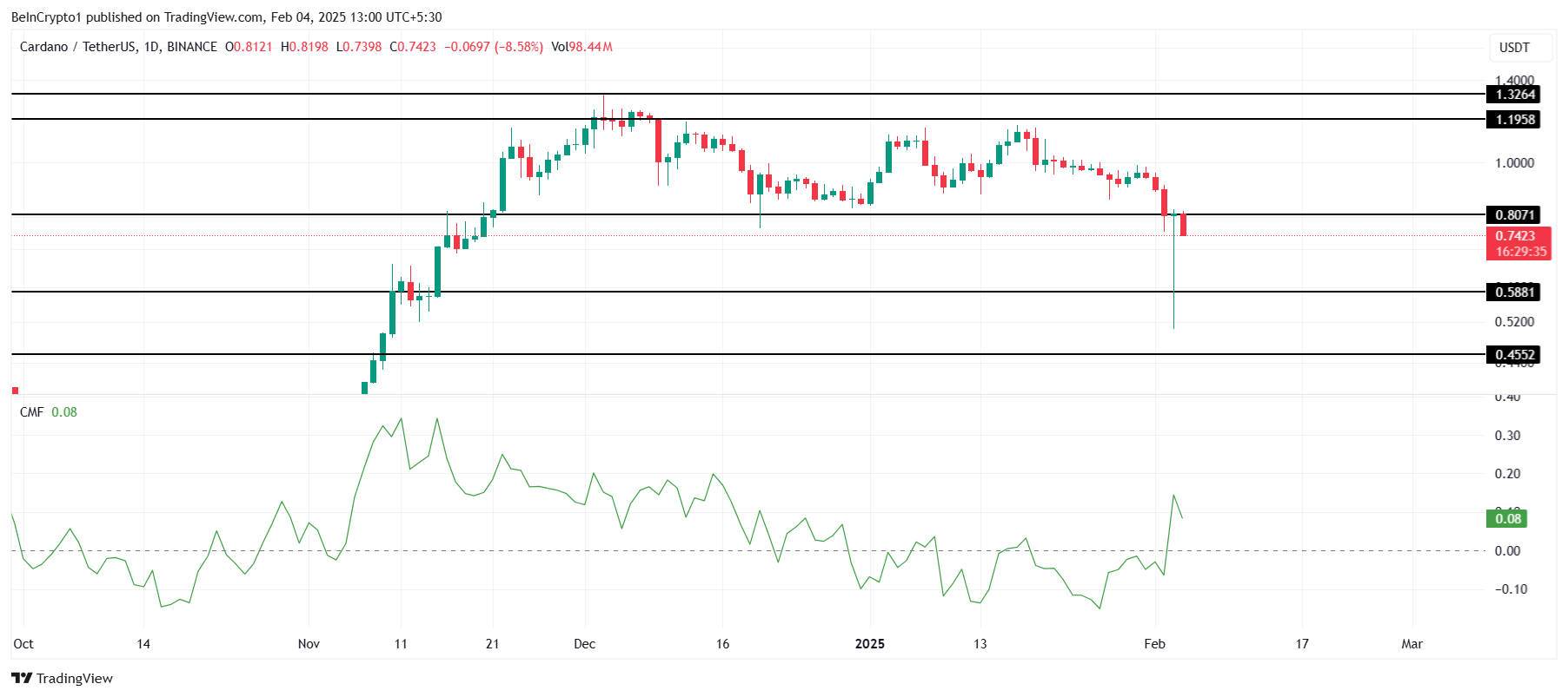Vahvojen sijoitusten ja lisääntyneen sijoittajakiinnostuksen myötä Cardanon tekniset indikaattorit viittaavat lupaavaan palautumiseen. Positiivisen CMF:n ja MVRV-suhteen suotuisan aseman yhdistelmä vahvistaa hinnan nousun todennäköisyyttä, joka voi johtaa huomattavaan nousupotentiaaliin lyhyellä ja keskipitkällä aikavälillä, tarjoten suotuisan ympäristön sijoittajille, jotka haluavat hyötyä ADA:n palautumisesta.
