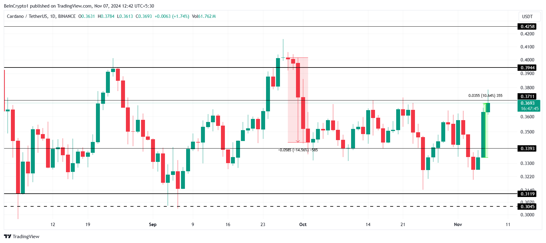Cardanon äskettäinen 10%:n ralli on tuonut sen takaisin kriittiselle vastustustasolle 0,37 dollaria. Vaikka ylöspäin suuntautuva liike on herättänyt optimismin, tämä saattaa merkitä vain uuden konsolidaatiovaiheen alkua. Historiallisesti ADA on kamppaillut ylläpitämään ylöspäin suuntautuvaa liikehdintää tämän hinnan yläpuolella, usein pysähtyen 0,37 dollariin.