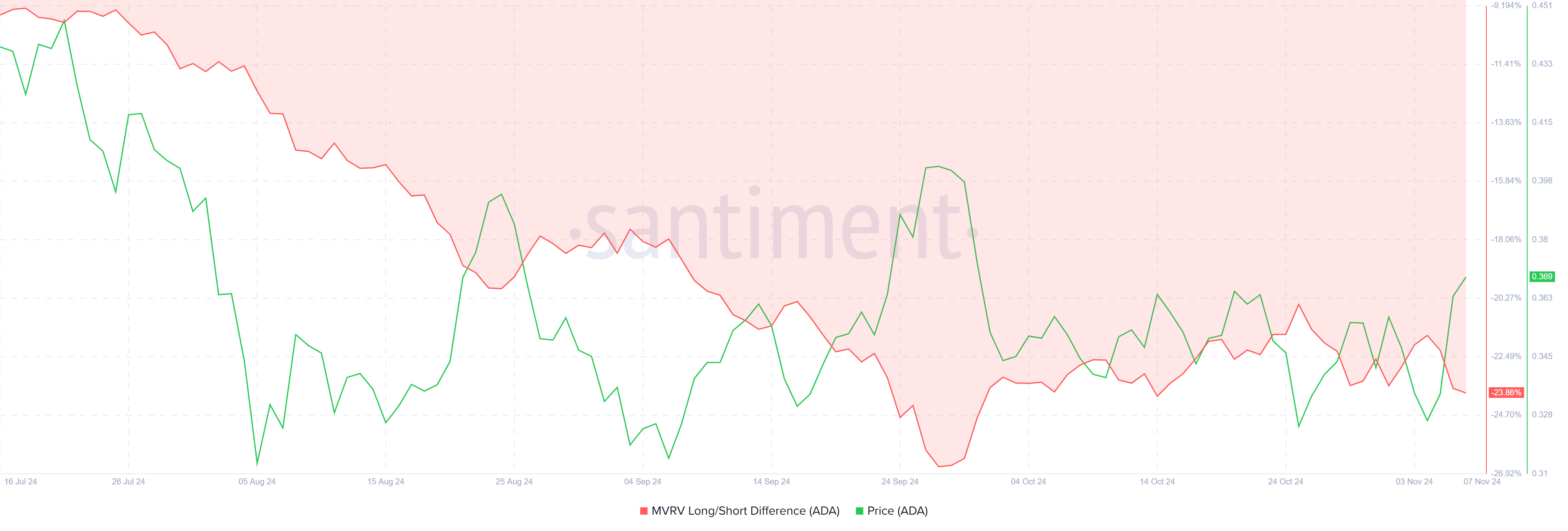 Cardanon markkinatunnelma heijastaa varovaisuutta, kuten näkyy MVRV:n (Market Value to Realized Value) pitkän/aikavälin erossa, joka on tällä hetkellä -23%. Negatiivinen MVRV:n pitkän/aikavälin ero osoittaa, että lyhyen aikavälin sijoittajat (STHs) ovat voitolla, mikä usein johtaa näiden sijoittajien voittojen kotiuttamiseen ja mahdolliseen myyntipaineeseen.