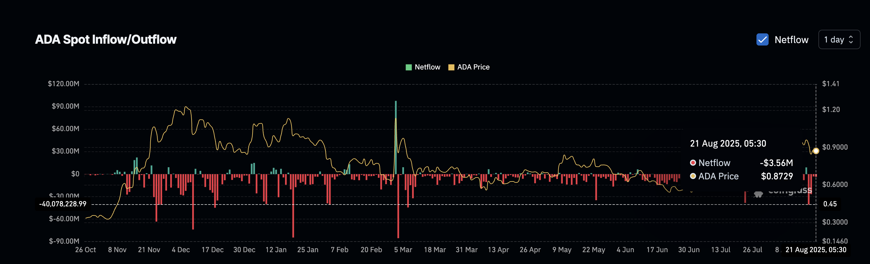 Viime päivinä ADAn nettovirrat spot-markkinoilta ovat hidastuneet huomattavasti. Paikallisessa huipussaan Cardano kirjasi 40,07 miljoonan dollarin päivittäiset ulosvirtaukset: selvä merkki vahvasta ostouskosta, kun kauppiaat vetivät kolikoita pois pörsseistä.