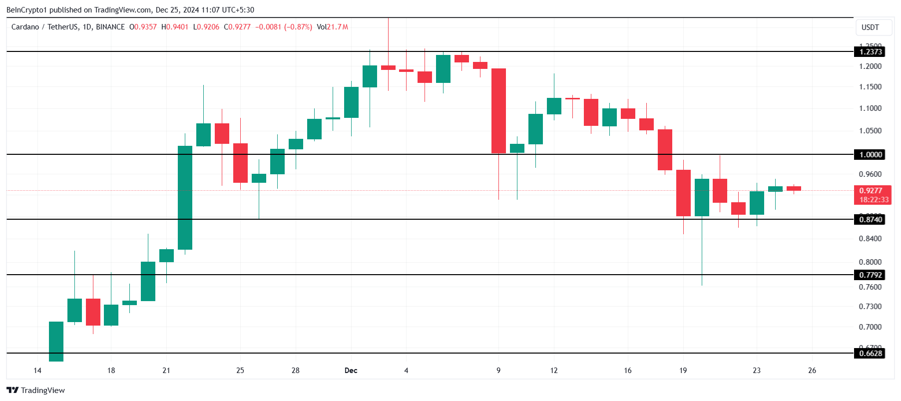 Huolena on myös hinnan kasvun puute. Sijoittajakunnan väheneminen näkyy, kun ADAn kaupankäyntivolyymi pysähtyy. Ilman lisääntynyttä markkinaosallistumista Cardanon mahdollisuus merkittävään palautumiseen vähenee, jättäen altcoinin alttiiksi hintojen lisälaskulle.