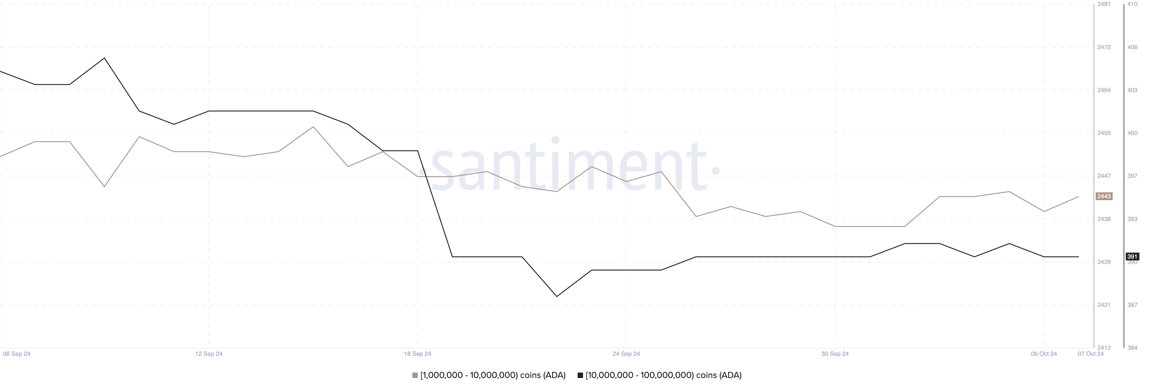Tällä hetkellä 2 443 osoitetta pitää hallussaan 1 miljoonaa ja 10 miljoonaa ADA:ta, kun taas 391 osoitetta pitää hallussaan 10 miljoonaa ja 100 miljoonaa ADA:ta, mikä osoittaa vähäistä muutosta heidän asemissaan.