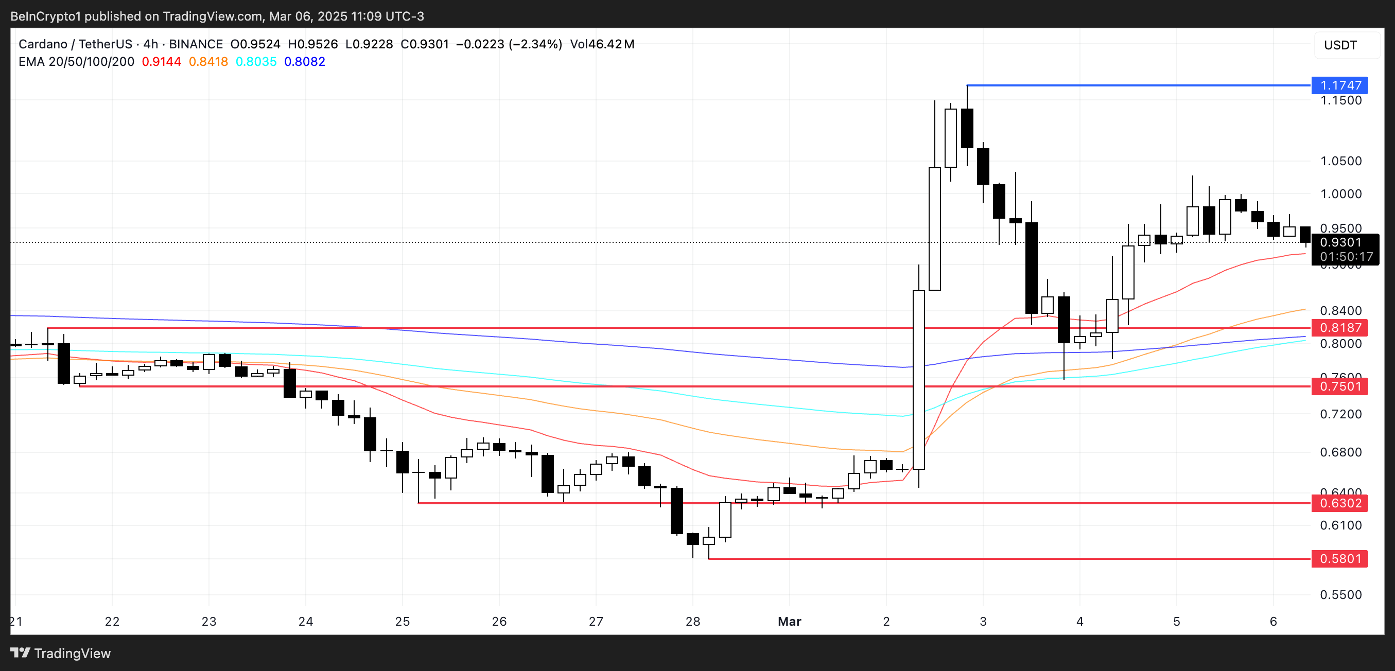 Vaikka tämä asettelu on positiivinen, Cardanon hinta on kamppaillut murtautuakseen yli 1 dollarin viime päivinä, jyrkän korjauksen jälkeen 71 %:n nousun jälkeen 2. maaliskuuta. Tämä viittaa siihen, että vaikka suuntaus on yhä voimassa, 1 dollarin vastus on vaikea ylittää.