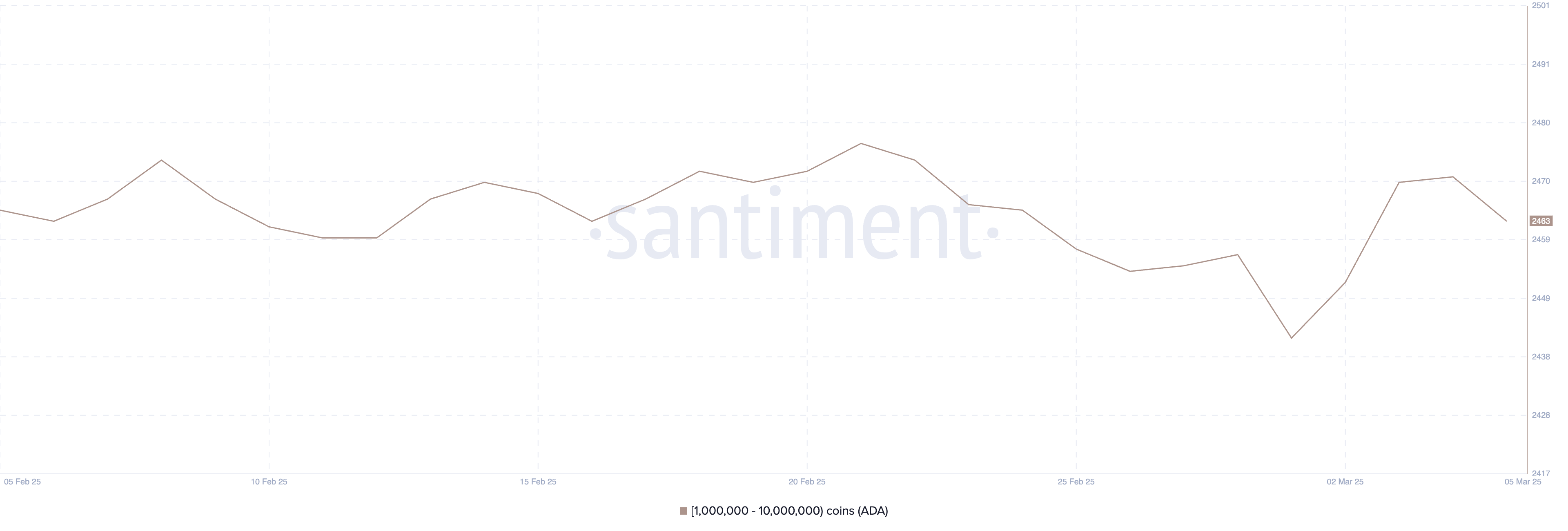 Cardano-valaiden – osoitteet, jotka pitävät hallussaan 1–10 miljoonaa ADA:ta – määrä on laskenut hieman viime päivinä, voimakkaan nousun jälkeen 1. ja 4. maaliskuuta välillä, jolloin se nousi 2 442:sta 2 471:een.