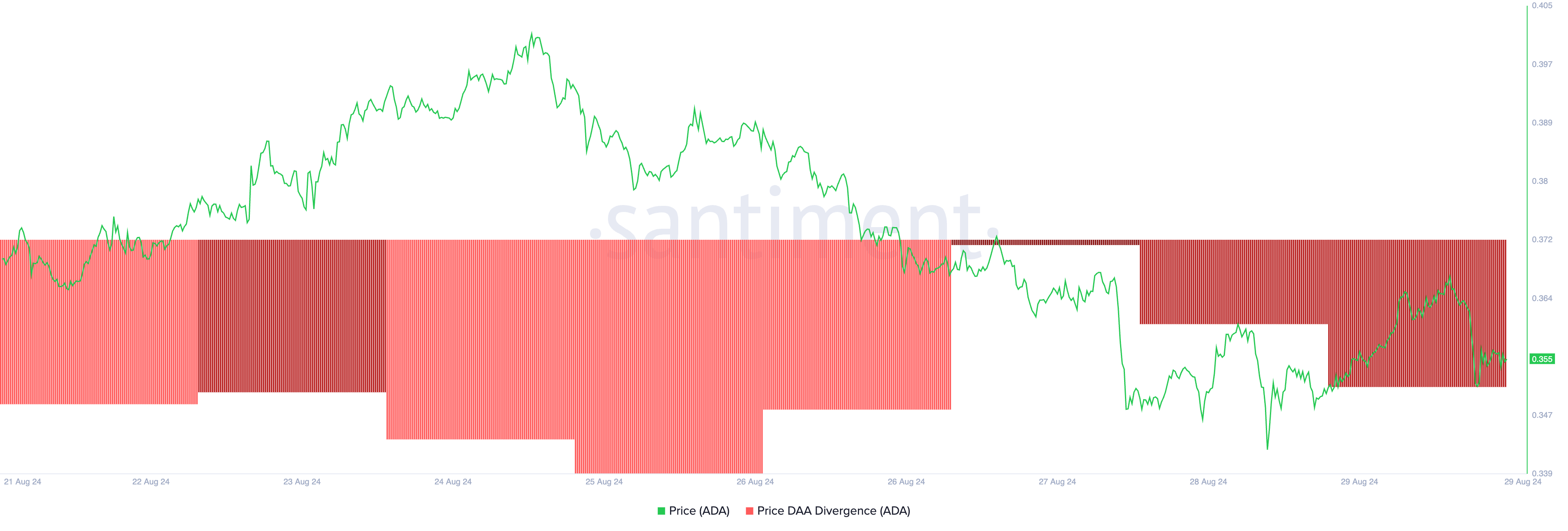 ADA:n negatiivinen hinta-päivittäinen aktiivinen osoite (DAA) -erottelu vahvistaa edelleen kysynnän laskua, sillä se vertaa suoraan hintaliikkeitä päivittäisten aktiivisten osoitteiden muutoksiin. Tämä tunnusluku seuraa, tukeeko omaisuusvaran hintaliike vastaavaa verkkotoimintaa.