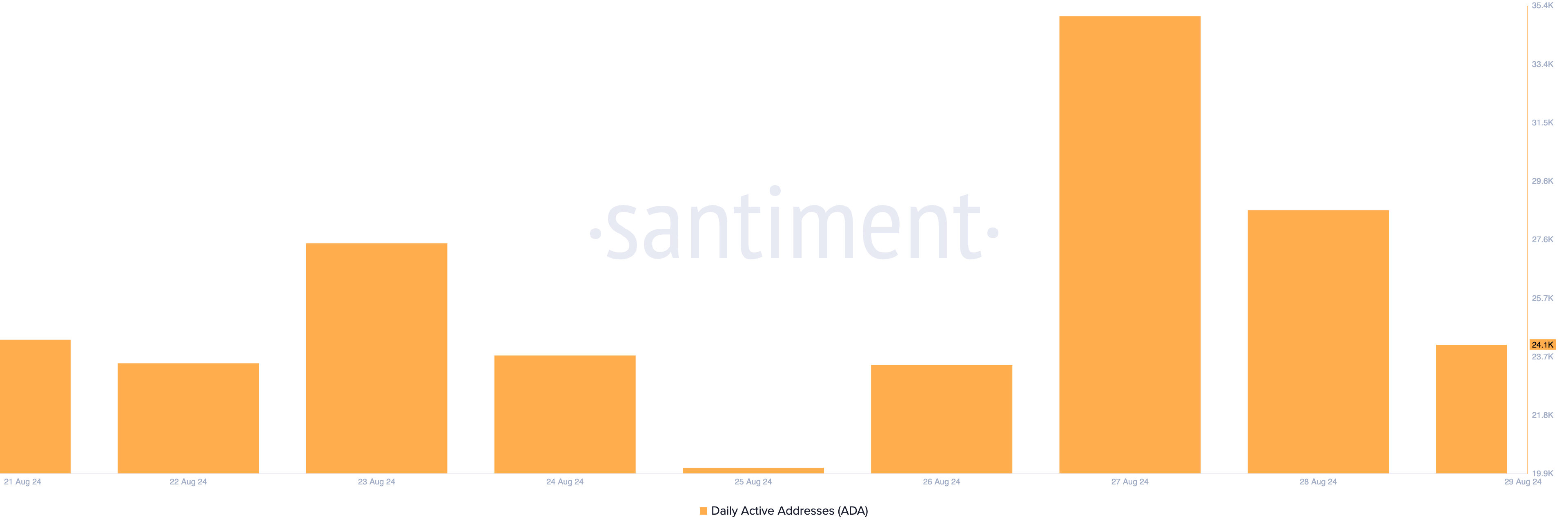 ADA-verkon toiminnan on-chain arviointi paljastaa päivittäisten aktiivisten osoitteiden laskun elokuun 27. päivästä lähtien. Santimentin tiedon mukaan ADA-transaktioihin osallistuvien osoitteiden päivittäinen määrä on laskenut 31 %, mikä osoittaa kysynnän vähenemistä altcoinille.