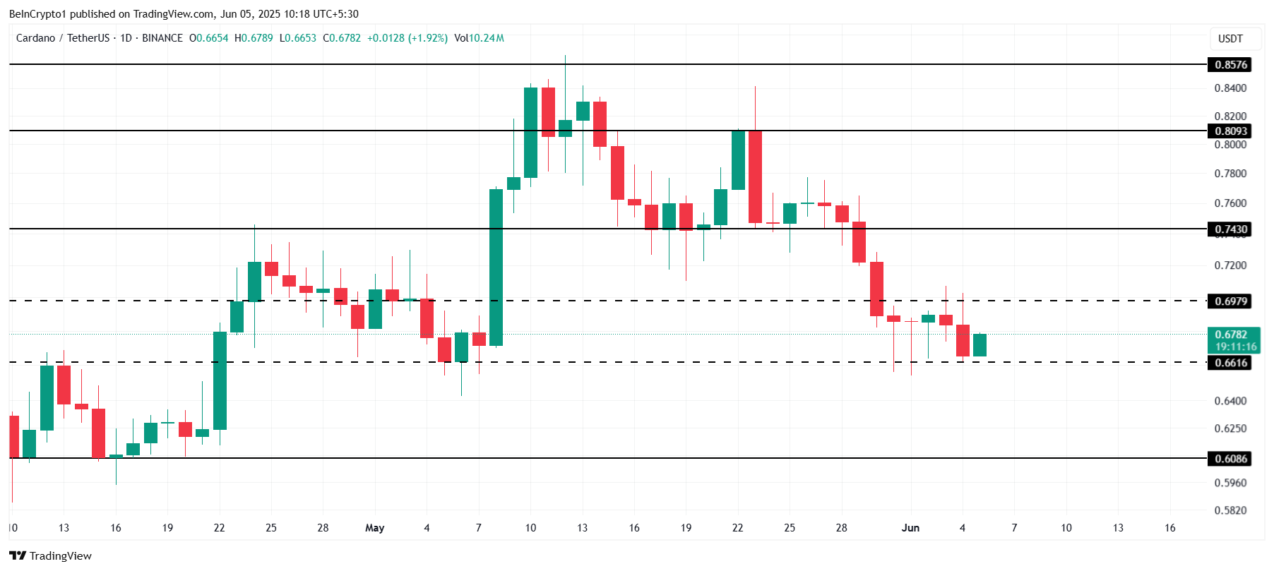 Cardanon nykyinen hinta on 0,67 dollaria, pysyen kriittisen 0,66 dollarin tuen yläpuolella. Jos hinta ei pysty pitämään tätä tukea, ADA voi kokea lisälaskua, mahdollisesti testaten 0,60 dollarin tasoa. Tämän keskeisen tuen menettäminen voisi avata tien lisätappioille, jatkaen käynnissä olevaa laskutrendiä.