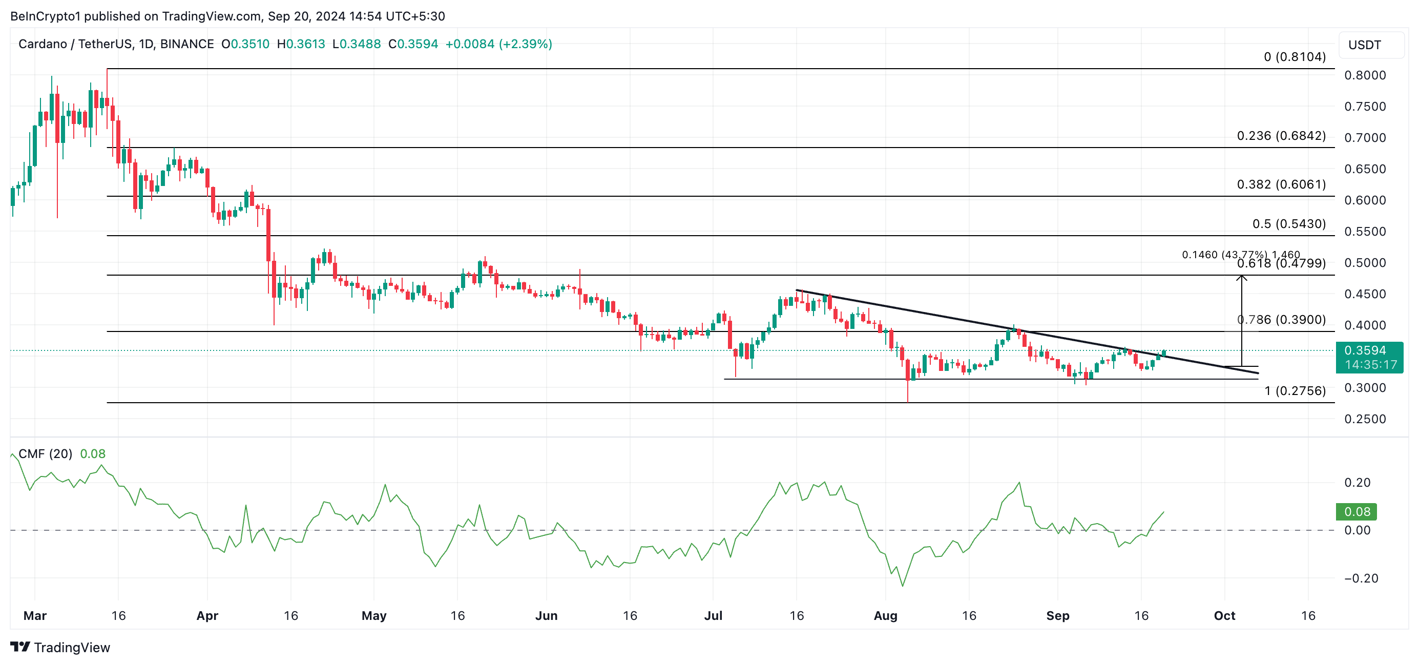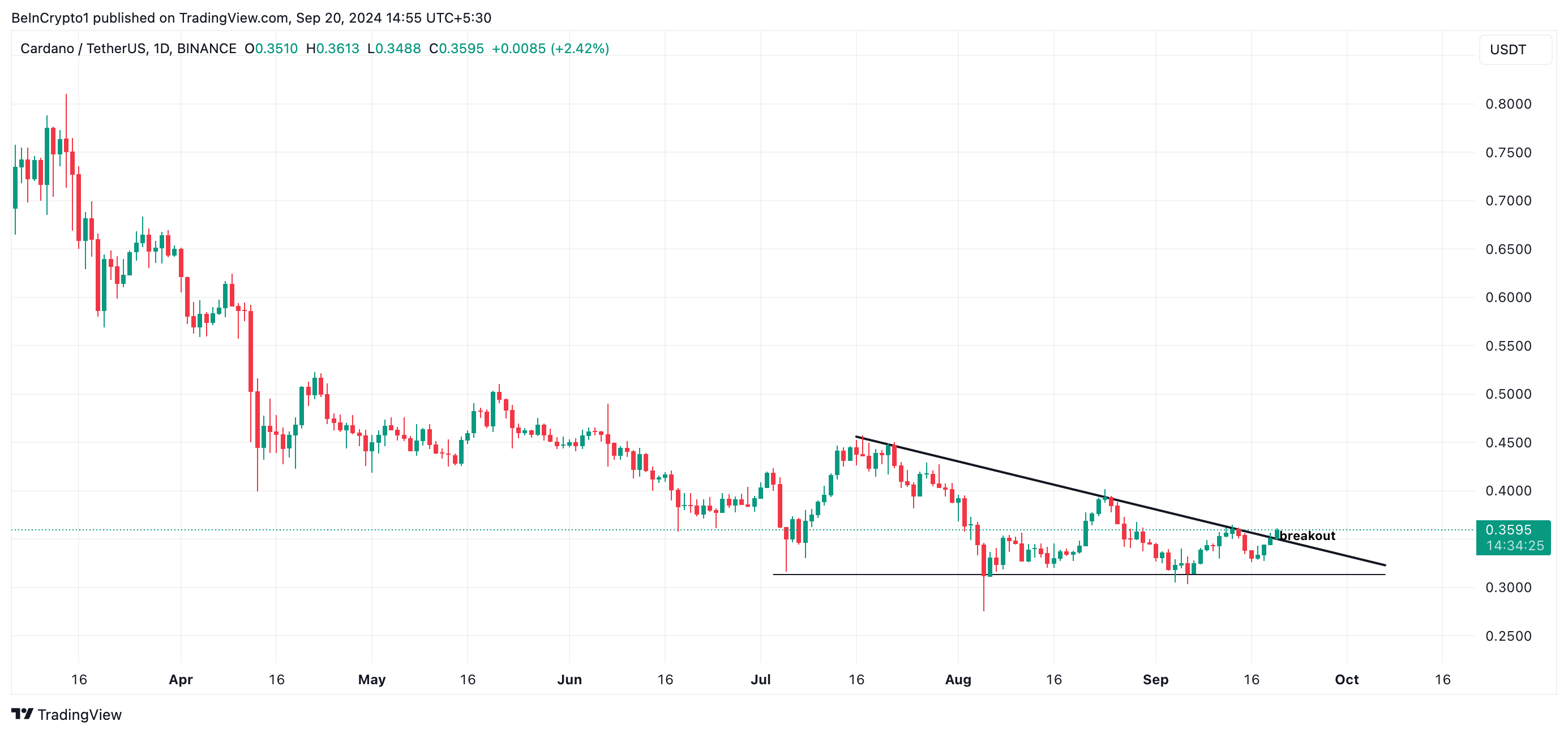 Cardanon 3%:n nousu viimeisen 24 tunnin aikana on työntänyt sen hinnan yli laskevan kolmion ylälinjan. Tämä kuvio ilmenee, kun omaisuusvaran hinta vaihtelee kahden yhtyvän trendilinjan välillä: yksi laskeva, joka edustaa vastusta, ja yksi tasainen tai hieman vaakasuoraan kallistuva linja, joka edustaa tukea.
