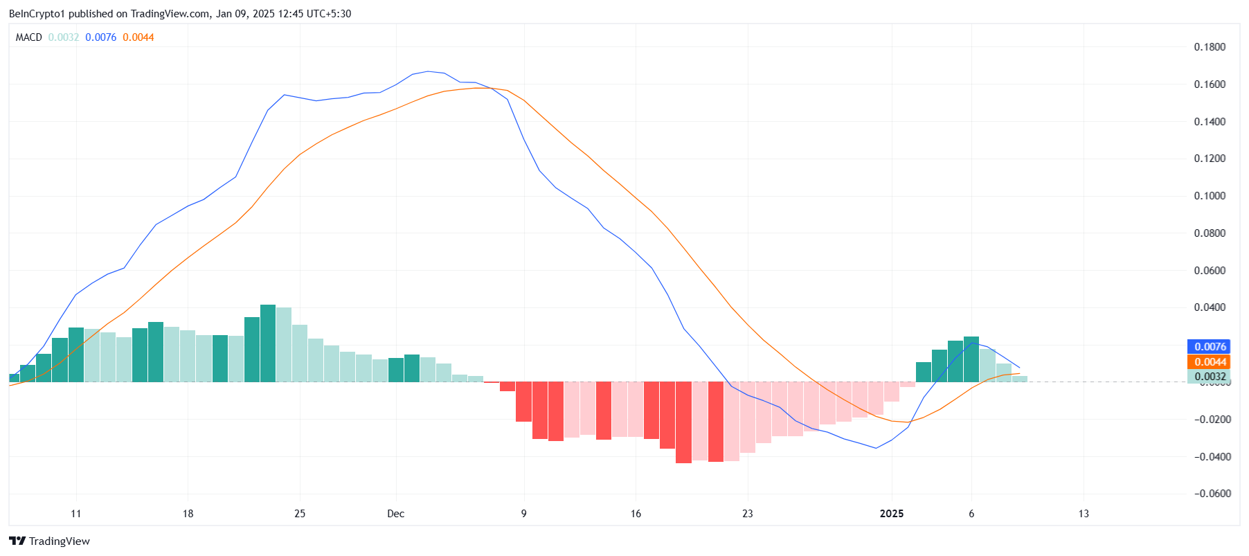 Cardanon makrotason momentum osoittaa myös heikkouden merkkejä, kun MACD-indikaattori lähestyy karhumaista risteämistä. Alle viikko sitten ADA osoitti härkämäistä risteämistä, mutta siirtyminen karhumaisuuteen korostaa laajempien markkinasignaalien vaikutusta kryptovaluuttaan. Tämä viittaa siihen, että Cardano saattaa kohdata lisää laskupainetta tulevina päivinä.