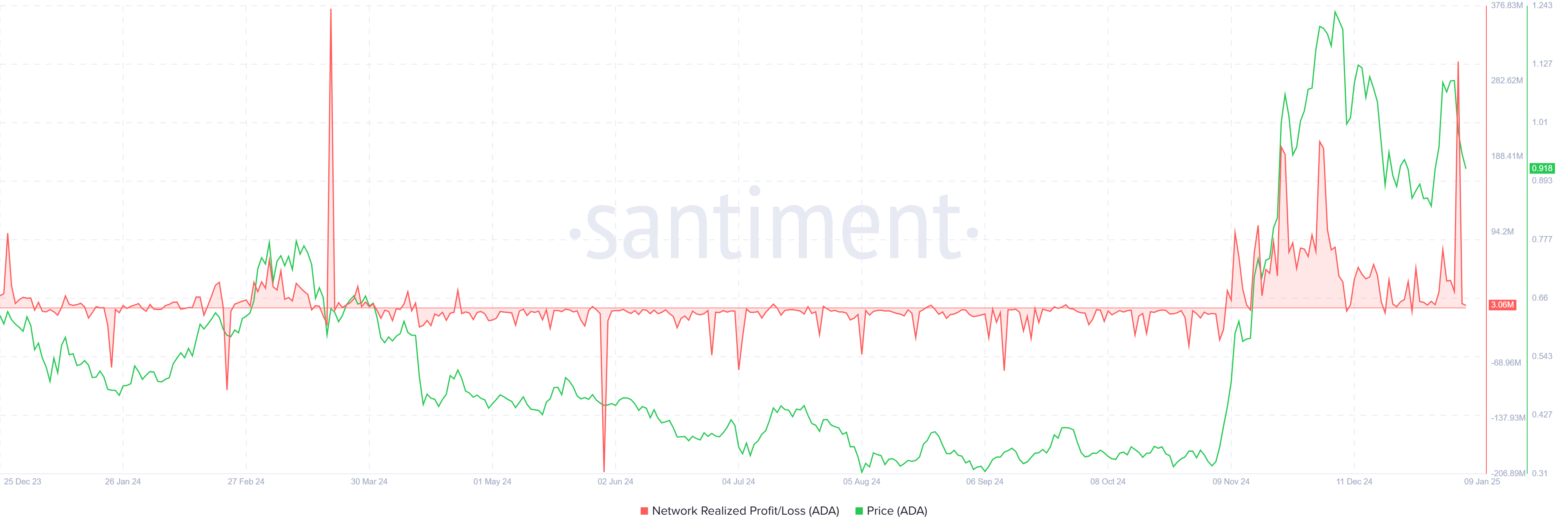 Cardanon realisoidut voitot nousivat dramaattisesti viimeisen 24 tunnin aikana, saavuttaen 9 kuukauden huipun 307 miljoonalla ADA:lla. Tämä noin 276 miljoonan dollarin nousu korostaa paniikkimyynnin voimakkuutta. Myyntiaalto osui yhteen Cardanon hinnan laskun kanssa, mikä heijastaa kasvavaa skeptisyyttä sijoittajien keskuudessa altcoinin lyhyen aikavälin palautumismahdollisuuksista.