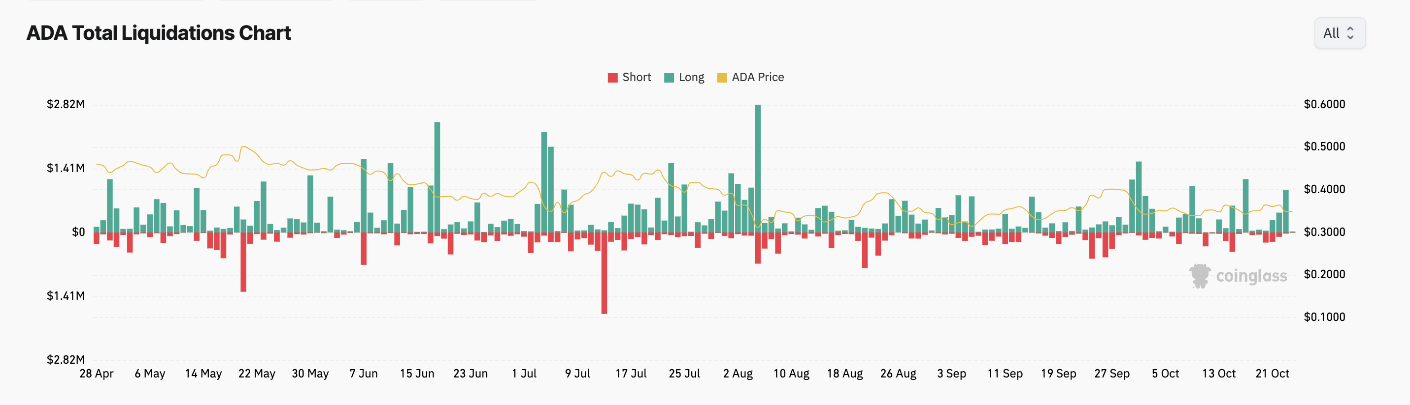 Lisäksi nämä pitkät positiot ovat kohdanneet kasvavia likvidointeja, kun ADAn hinta jatkaa laskuaan. Pitkien likvidoinnit tapahtuvat, kun pitkiä positioita hallussaan pitävät kauppiaat pakotetaan myymään omaisuutensa alempaan hintaan tappioiden lieventämiseksi, kun markkinat kääntyvät heitä vastaan.