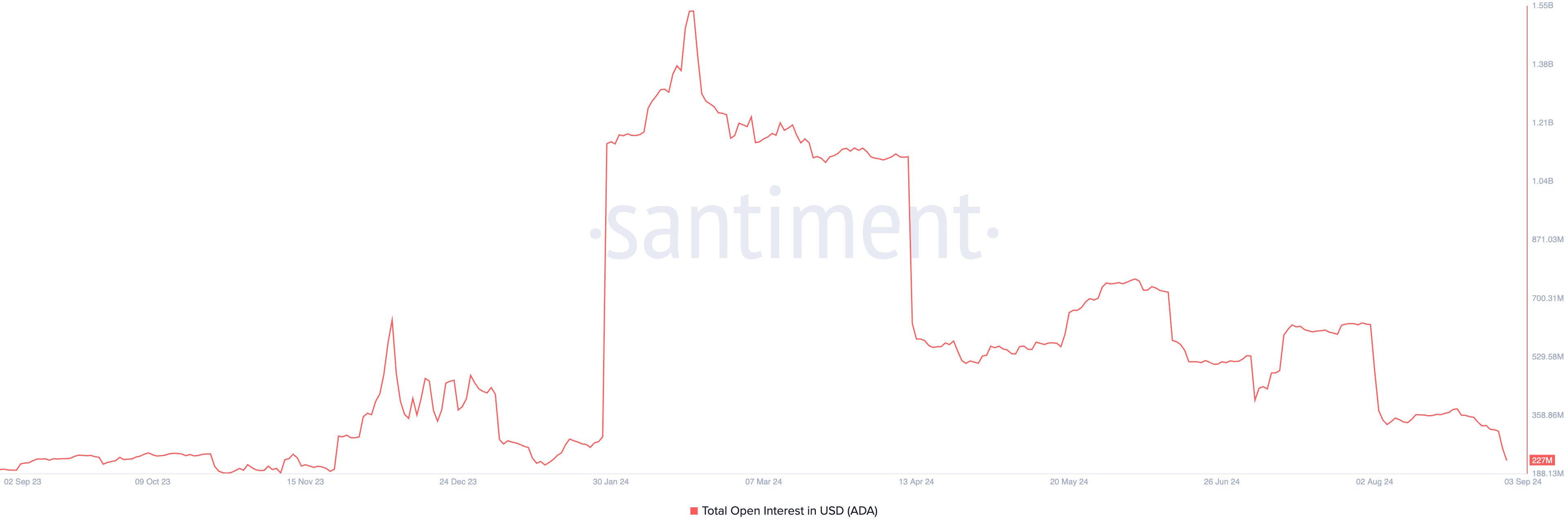 Cardanon (ADA) Open Interest aloitti uuden laskusuunnan 1. elokuuta, pudoten 63% siitä lähtien. Tällä hetkellä se on 227 miljoonaa dollaria, mikä on alhaisin taso sitten tammikuun.