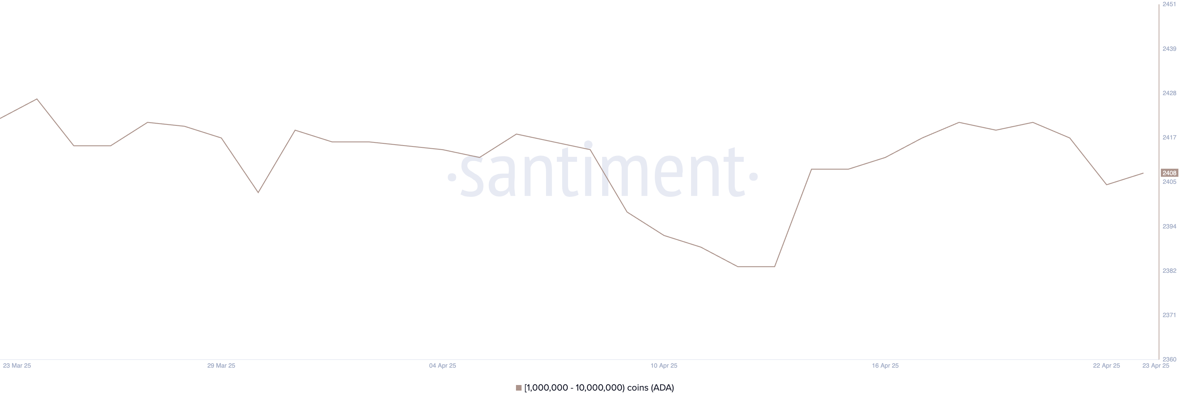 Cardano-valasosoitteiden määrä—lompakot, jotka sisältävät 1–10 miljoonaa ADA:ta—on hieman noussut 2 408:aan, kun se oli 2 405 huhtikuun 22. päivänä.