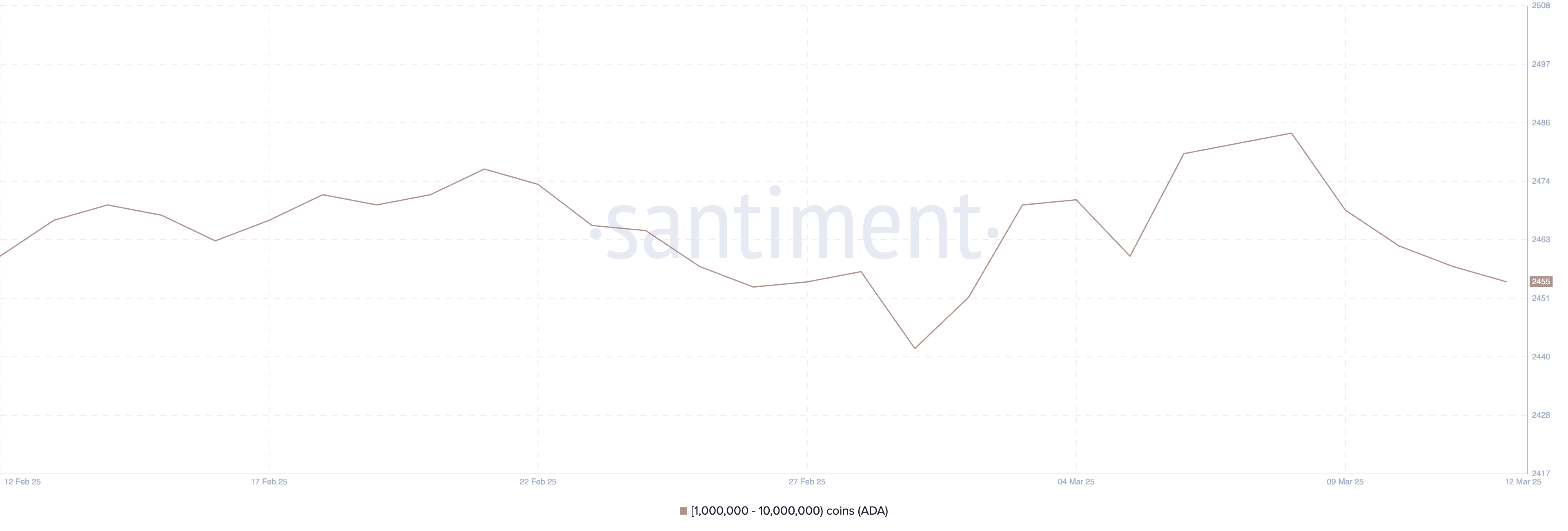 Cardano-valasosoitteiden määrä – ne, jotka pitävät hallussaan 1-10 miljoonaa ADA:ta – on pudonnut 2 455:een, laskien 2 484:stä 8. maaliskuuta.