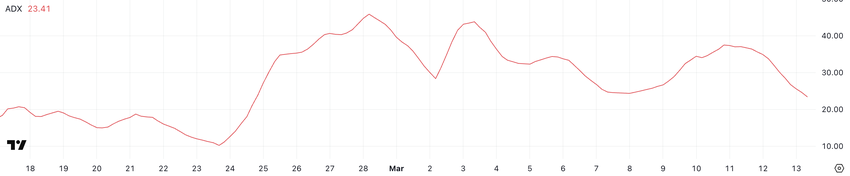 ADA:n Average Directional Index (ADX) on pudonnut 23,4:ään, laskien eilisestä 34:stä ja toissapäivän 37:stä. ADX on keskeinen indikaattori, jota käytetään mittaamaan trendin voimaa, suunnasta riippumatta, asteikolla 0:sta 100:aan.