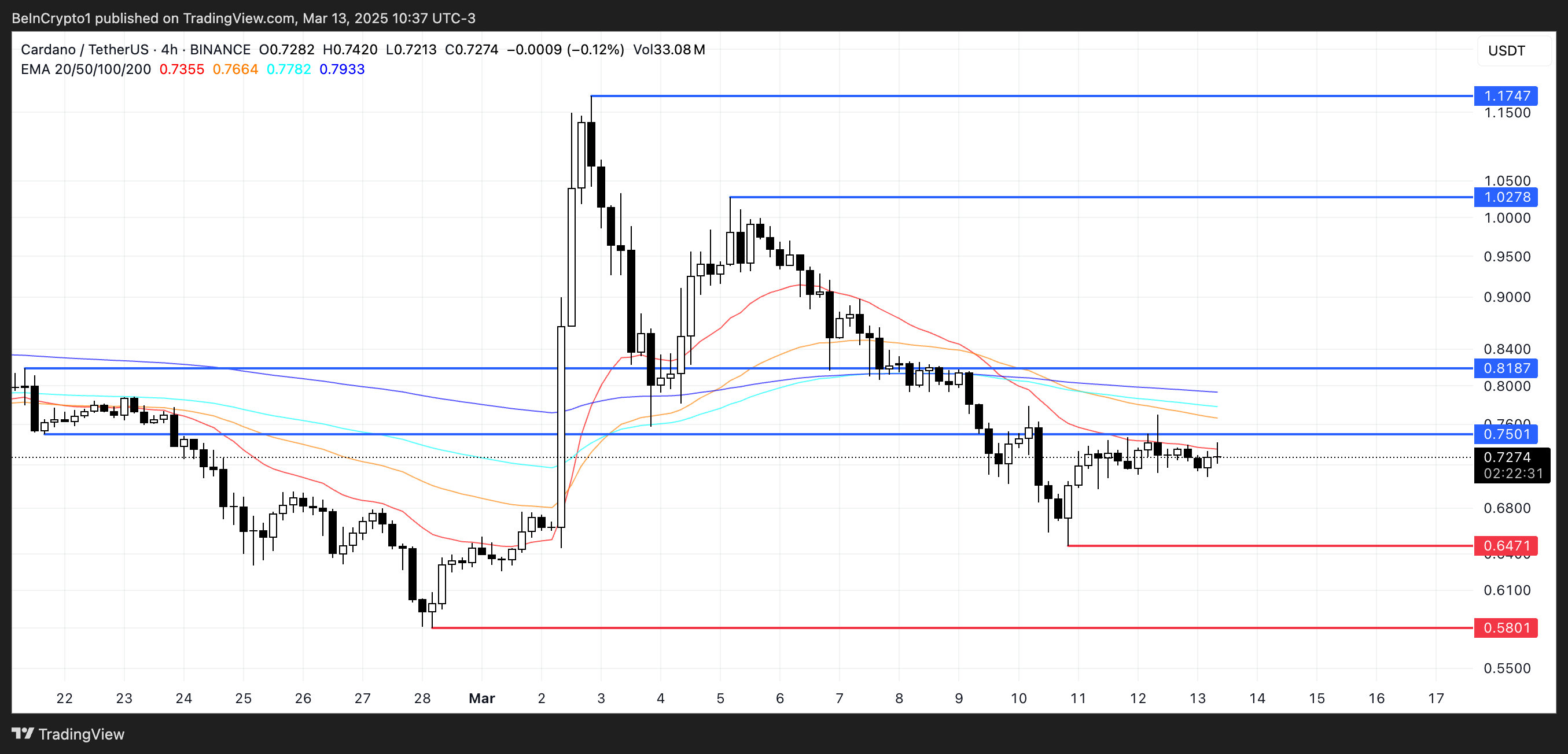 Suhteellisen lähellä olevat EMA-linjat osoittavat, että Cardano on ratkaisevassa vaiheessa, jolloin voi tapahtua joko läpimurto tai lasku.