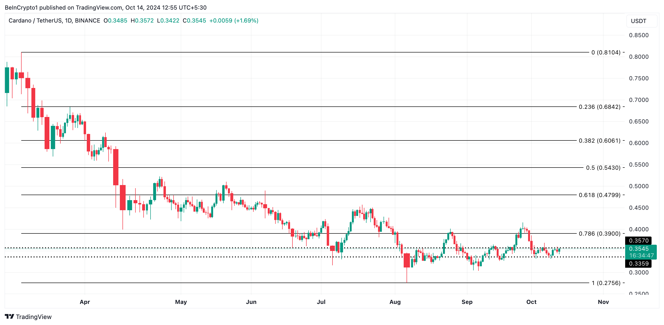 Cardanon hinta on heilunut kapealla alueella kuukauden alusta lähtien. Altcoin on kohdannut vastusta 0,36 dollarin tasolla ja löytänyt tukea 0,33 dollarin hintatasosta.