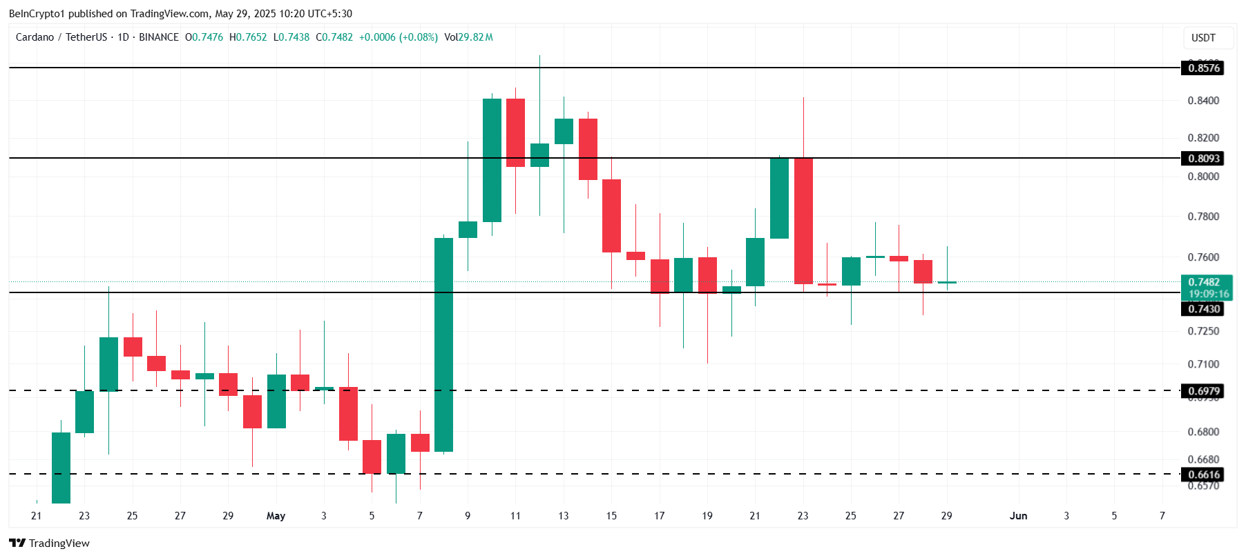 Cardanon hinta on tällä hetkellä 0,74 dollaria, pysyen tärkeiden tukitasojen yläpuolella. Korrelaation ja rahoitusasteen sekavat signaalit viittaavat siihen, että ADA todennäköisesti säilyttää tämän tuen lähitulevaisuudessa, tasapainottaen härkämäisten toiveiden ja karhumaisten riskien välillä.