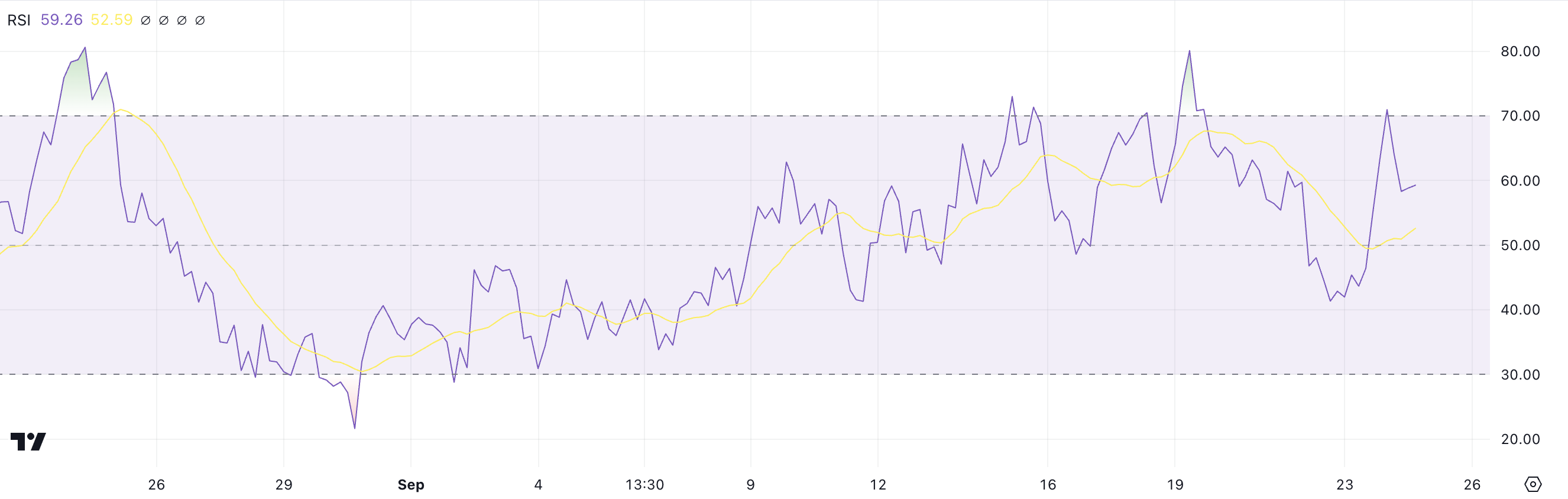 RSI, vauhtioskillaattori, joka mittaa hintaliikkeiden nopeutta ja muutosta asteikolla 0-100, korostaa markkinaolosuhteita. Lukema yli 70 osoittaa yliostettua, kun taas alle 30 viittaa ylialennettuun.