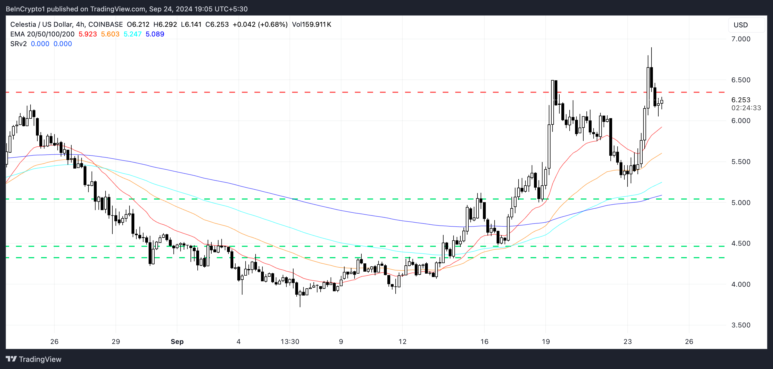 Jos Celestian hinta voi jatkaa tätä vauhtia, se saattaa rikkoa 7 dollarin vastusalueen, joka on merkittävä psykologinen este. Onnistunut murtuminen voisi työntää altcoinin kohti 7,5 dollaria, mikä on sen korkein taso heinäkuusta 2024 lähtien.