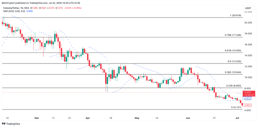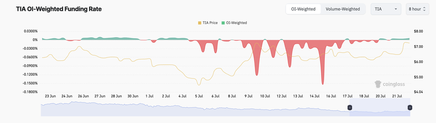 TIA: n arvon pitkäaikainen lasku sai monet sen futuurikauppiaat lyömään vetoa sitä vastaan. Coinglassin tietojen mukaan tokenin rahoitusaste kryptovaluuttapörsseissä oli ensisijaisesti negatiivinen 4.–19. heinäkuuta.