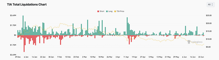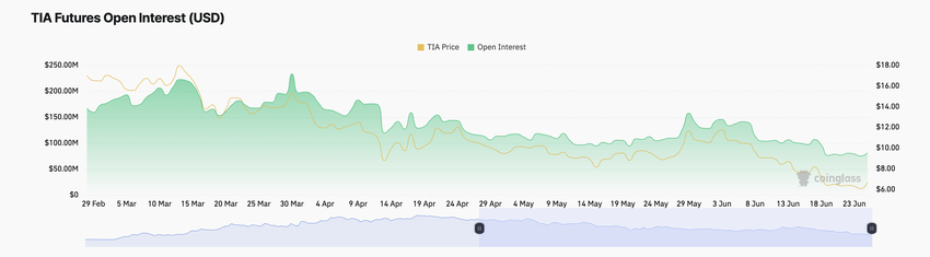 Vuoden alusta (YTD) altcoinin futuurien avoin korko on pudonnut 44 %. Nykyisellä tasollaan TIA:n futuurien avoin korko on alimmillaan sitten 11.11.2023.