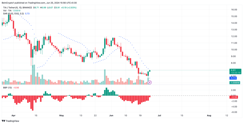TIA:n negatiivinen Elder-Ray-indeksi vahvistaa laskevan tunnelman, joka tällä hetkellä seuraa altcoinia. Lehdistöhetkellä tämän indikaattorin arvo on -0,55. Kontekstin vuoksi se on palauttanut vain negatiivisia arvoja 6. kesäkuuta jälkeen.