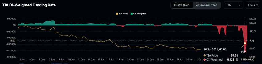 TIA:n rahoitusaste on kääntynyt negatiiviseksi positiivisesta ja saavuttanut korkeimman pisteen sen perustamisen jälkeen. Negatiivinen rahoitusaste osoittaa tyypillisesti, että lyhyet positiot maksavat pitkiä positioita, mikä heijastaa kauppiaiden laskevaa tunnelmaa.