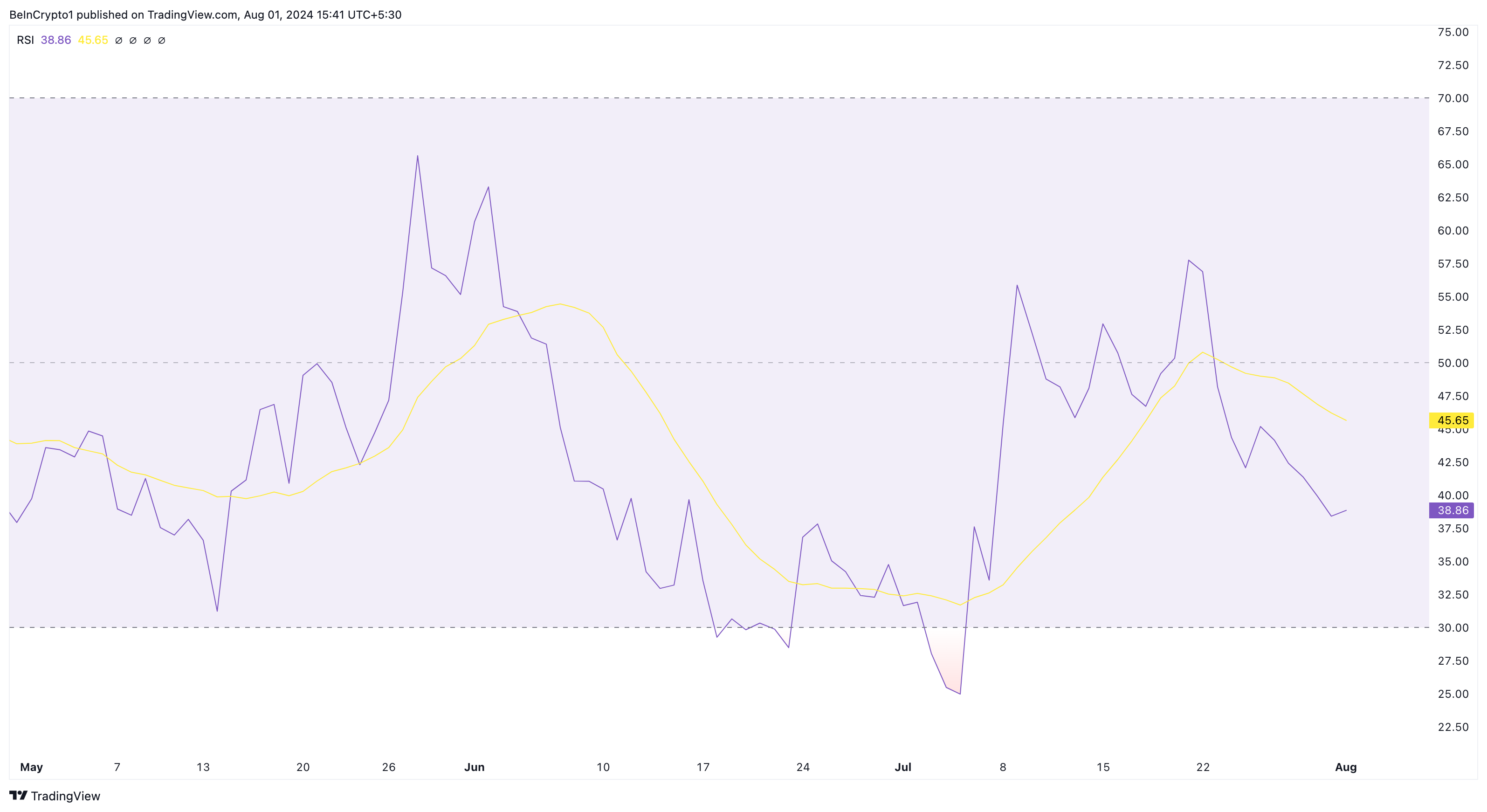 Päivittäisen kaavion arvioinnista paljastuu, että suhteellisen voimaindeksin (RSI) lukema on 38,86. RSI on tekninen indikaattori, joka mittaa kryptovaluutan nopeutta ja hintamuutoksia. Lisäksi oskillaattori määrittää, onko omaisuusvara yliostettu tai ylimyyty.