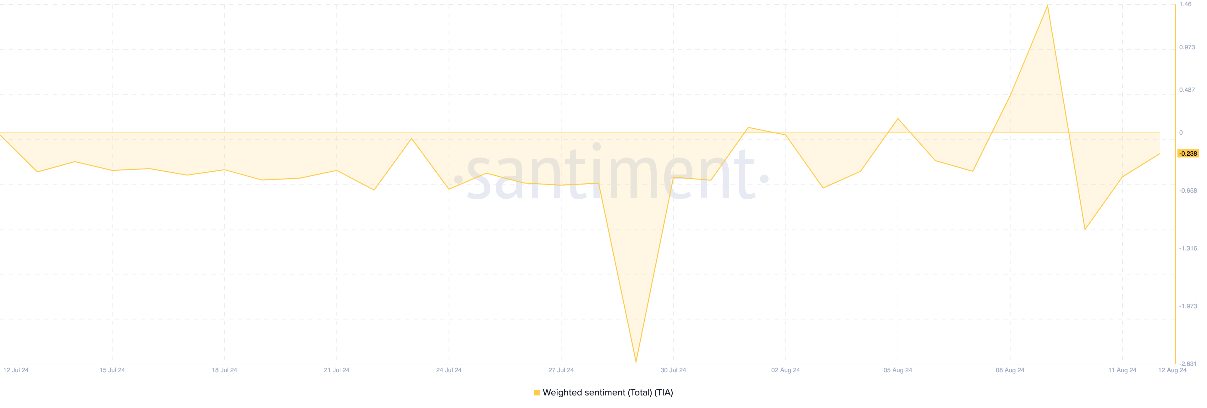 Huolimatta mahdollisesta laskusta, tunnelma TIA:n ympärillä näyttää paranevan. Santimentin mukaan TIA:n painotettu tunnelma on tällä hetkellä -0,238. Tämä tunnusluku mittaa, ovatko verkossa olevat kommentit kryptovaluutasta yleisesti ottaen optimistisia vai pessimistisiä.