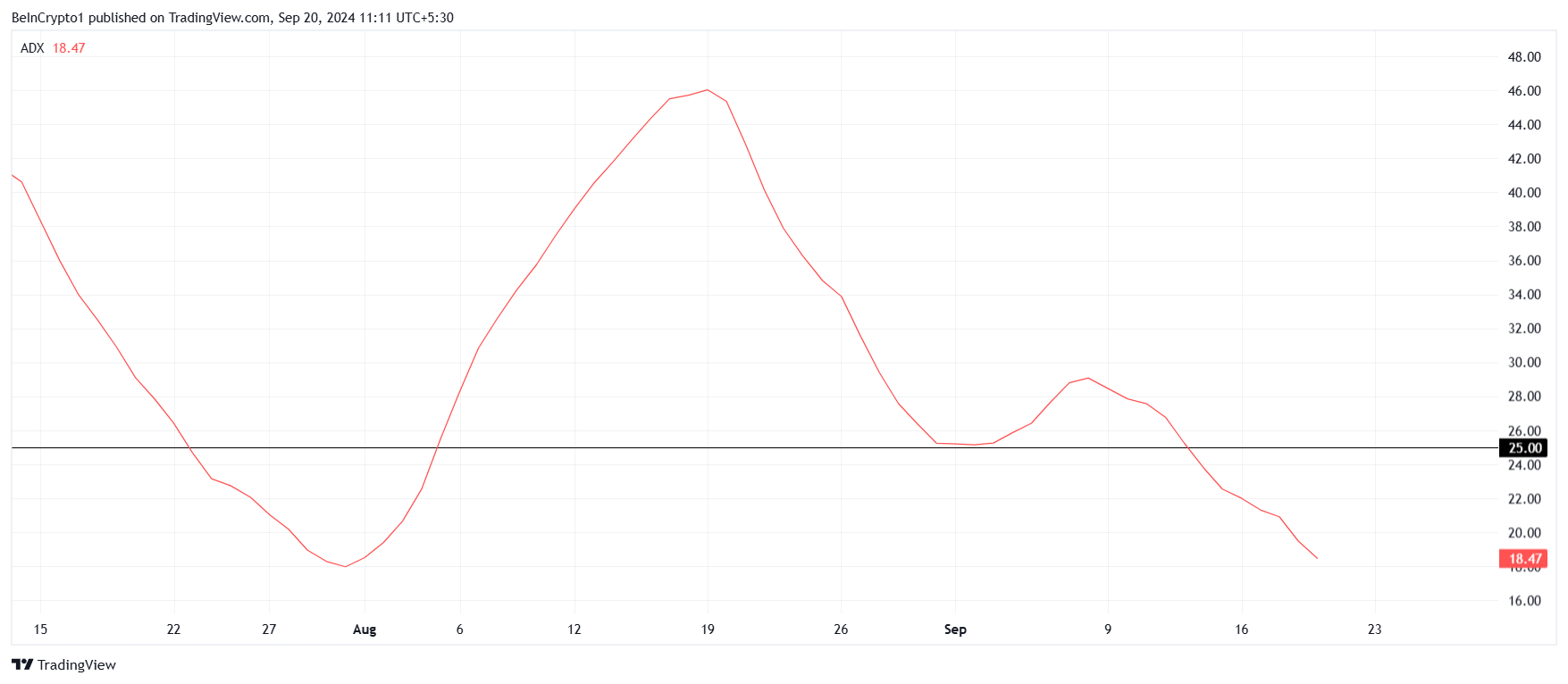 Lisäksi Chainlinkin makrotason liikehdintä viittaa siihen, että sen yritykset hintarallille saattavat jatkossakin epäonnistua. Keskimääräinen suuntausindeksi (ADX), joka mittaa trendin voimakkuutta, osoittaa, että LINKin nousutrendi on menettänyt merkittävästi voimaa. ADX on laskenut alle 25,0 kynnysarvon, mikä viestii markkinoiden heikkoudesta.