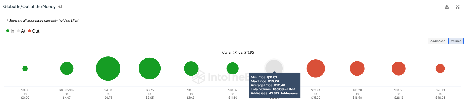 Global In/Out of the Money (GIOM) -indikaattorin mukaan noin 106,89 miljoonaa LINK-kolikkoa on kertynyt hintojen ollessa 11,61 ja 13,24 dollarin välillä, edustaen yli 1,2 miljardin dollarin arvoista tarjontaa.
