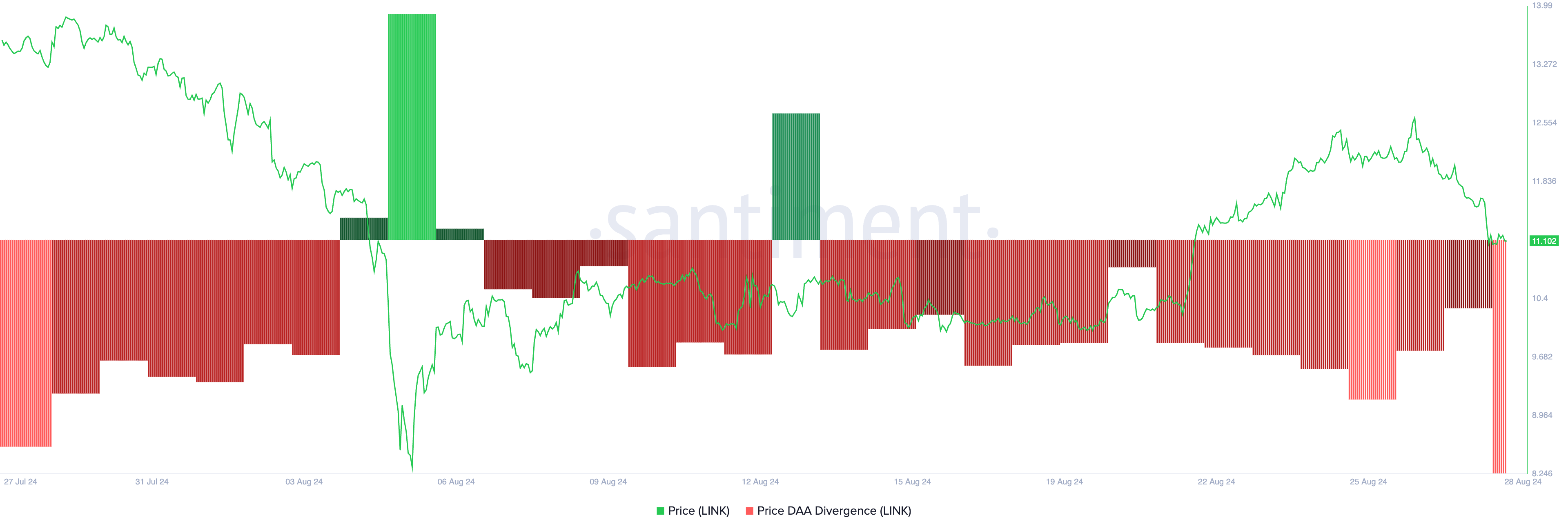 LINKin kysynnän lasku viime päivinä on vahvistettu ketjussa sen negatiivisella hinta-päivittäin aktiivisten osoitteiden (DAA) divergenssillä.